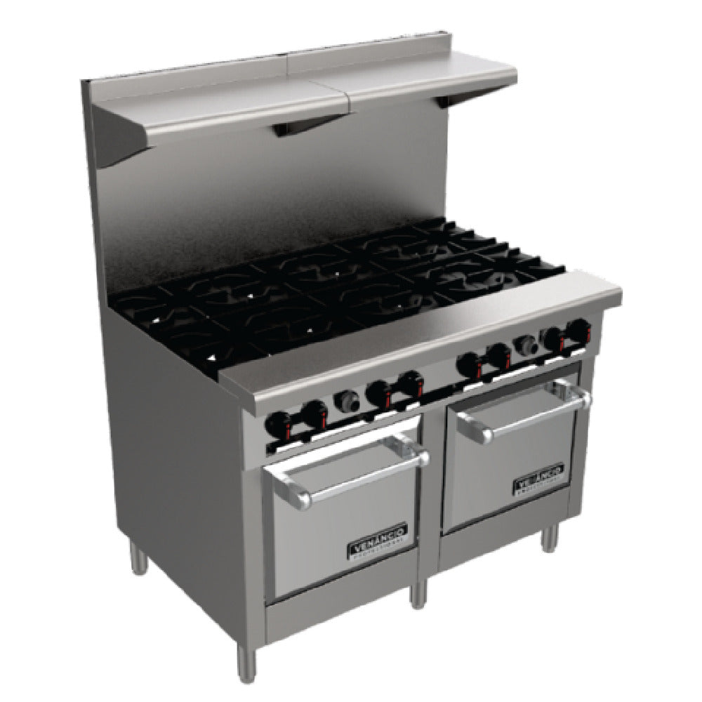 The Venancio R722ST-72B_NAT Restaurant Range Gas 72"W is a high-performance cooking appliance designed for professional kitchens, boasting an impressive configuration featuring twelve two-piece cast iron non-clog burners. Each burner operates with independent manual control valves, ensuring precise control over cooking temperatures. The removable cast iron grates facilitate easy cleaning and maintenance, while the standing pilot system enhances operational readiness. This robust range includes two standard ovens, each equipped with spark ignition, two racks, and three adjustable shelf positions, optimizing baking versatility. The ovens’ enamel-coated cavities cover the top, bottom, and sides, ensuring durability and efficient heat distribution. Built with a 14-gauge interlocking, fully welded frame, the range guarantees structural integrity and longevity. The stainless steel front and sides, complemented by a 22-1/2"H two-piece back guard with a removable shelf, offer both aesthetic appeal and functional convenience. Measuring 72 inches wide with a 7-inch front rail, the unit stands on 6-inch adjustable legs, providing stability and customization for varying kitchen layouts. With a total output of 454,000 BTU, the Venancio R722ST-72B_NAT is cULus and UL EPH Classified, also including an LP conversion kit and pressure regulator, making it an adaptable choice across different culinary sectors.