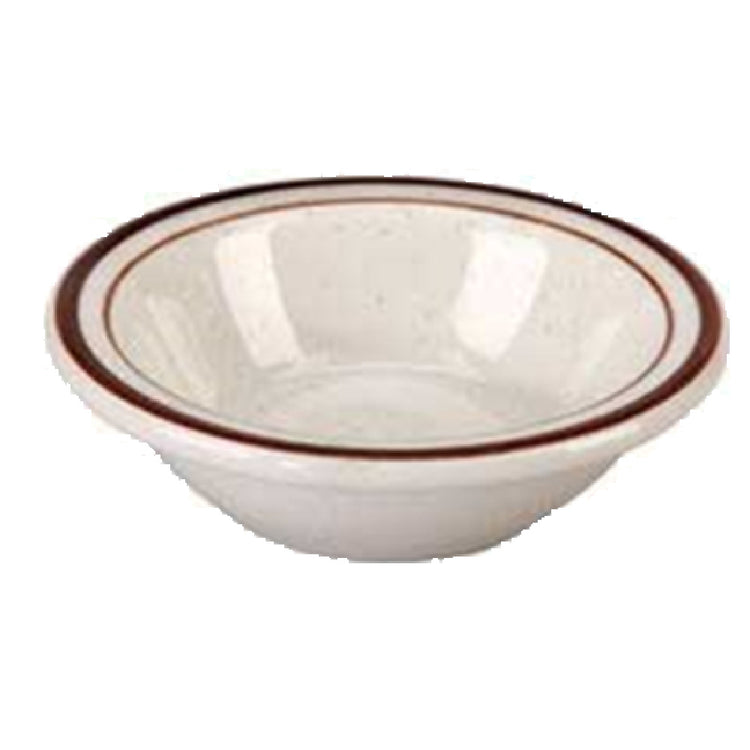The Vertex China CRV-11 Fruit Bowl is a meticulously crafted piece from the Caravan Collection, designed to elevate dining presentations in both casual and upscale environments. With a capacity of 4-3/4 oz. and a diameter of 4-5/8 inches, this round fruit bowl is ideal for serving small portions of fruits, desserts, or appetizers. The design features a narrow rim that enhances its aesthetic appeal while ensuring a comfortable serving experience. Made from vitrified china, the bowl delivers exceptional durability and resilience, ensuring longevity even with frequent use. Its brown speckled finish coupled with a double band accent adds a touch of elegance, making it a versatile choice that complements various table settings. The Vertex China CRV-11 is both microwave and dishwasher safe, providing convenience and efficiency for busy food service operations. This product is packed by 3 dozen per case, making it a practical choice for bulk purchasing in commercial settings. Its thoughtful design and robust construction make the Vertex China CRV-11 Fruit Bowl a valuable addition to any restaurant, hotel, or catering service, offering a harmonious blend of functionality and style.