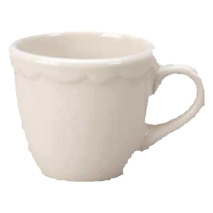 The Vertex China CSC-35 A.D. Cup 3-1/2 Oz. 2-1/2" is a meticulously designed piece from the California Scalloped Collection, catering to various market segments that value durability and elegance in dining ware. With a capacity of 3-1/2 ounces and a diameter of 2-1/2 inches, this cup is ideal for serving small portions of beverages, making it a perfect fit for restaurants, cafés, and hospitality businesses that focus on presentation and quality. The inclusion of a handle enhances its practicality and user experience. Its construction from vitrified china ensures a high level of scratch resistance, crucial for maintaining longevity and aesthetics in high-traffic service environments. Additionally, this cup is microwave and dishwasher safe, offering convenience in both heating and cleaning processes, which is highly desirable in fast-paced food service settings. The American White finish adds a touch of classic elegance, seamlessly fitting into various table settings. Designed to fit CSC-36, this product showcases versatility in matching other components of the collection. Packed by 3 dozen per case, it supports efficient inventory management for large-scale operations. The Vertex China CSC-35 A.D. Cup is a practical and stylish choice for any establishment looking to enhance its dining service offerings.