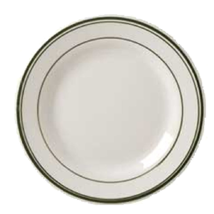 The Vertex China DMG-16 Plate 10-1/2" Dia. Round is an exquisite piece of vitrified china that stands out in the Del Mar Green Collection. With a diameter of 10-1/2 inches, this round plate features a wide rim and a rolled edge, making it both aesthetically pleasing and practical for various dining settings. Its microwave and dishwasher safe properties ensure convenience and ease of use in fast-paced environments such as restaurants and hotels. The plate's construction from vitrified china imparts durability and resistance to chipping, ensuring longevity in commercial settings. The American White color offers a timeless and versatile aesthetic, complementing diverse table settings and cuisines. Packaged in sets of one dozen, the DMG-16 plate is ideal for establishments seeking uniformity and reliability in their dinnerware. This plate is designed to meet the needs of both casual and fine dining experiences, offering a balance of elegance and function. Whether for everyday service or special occasions, the Vertex China DMG-16 Plate is a valuable choice for professionals in the hospitality industry, providing a high-quality dining solution with its robust construction and classic design.