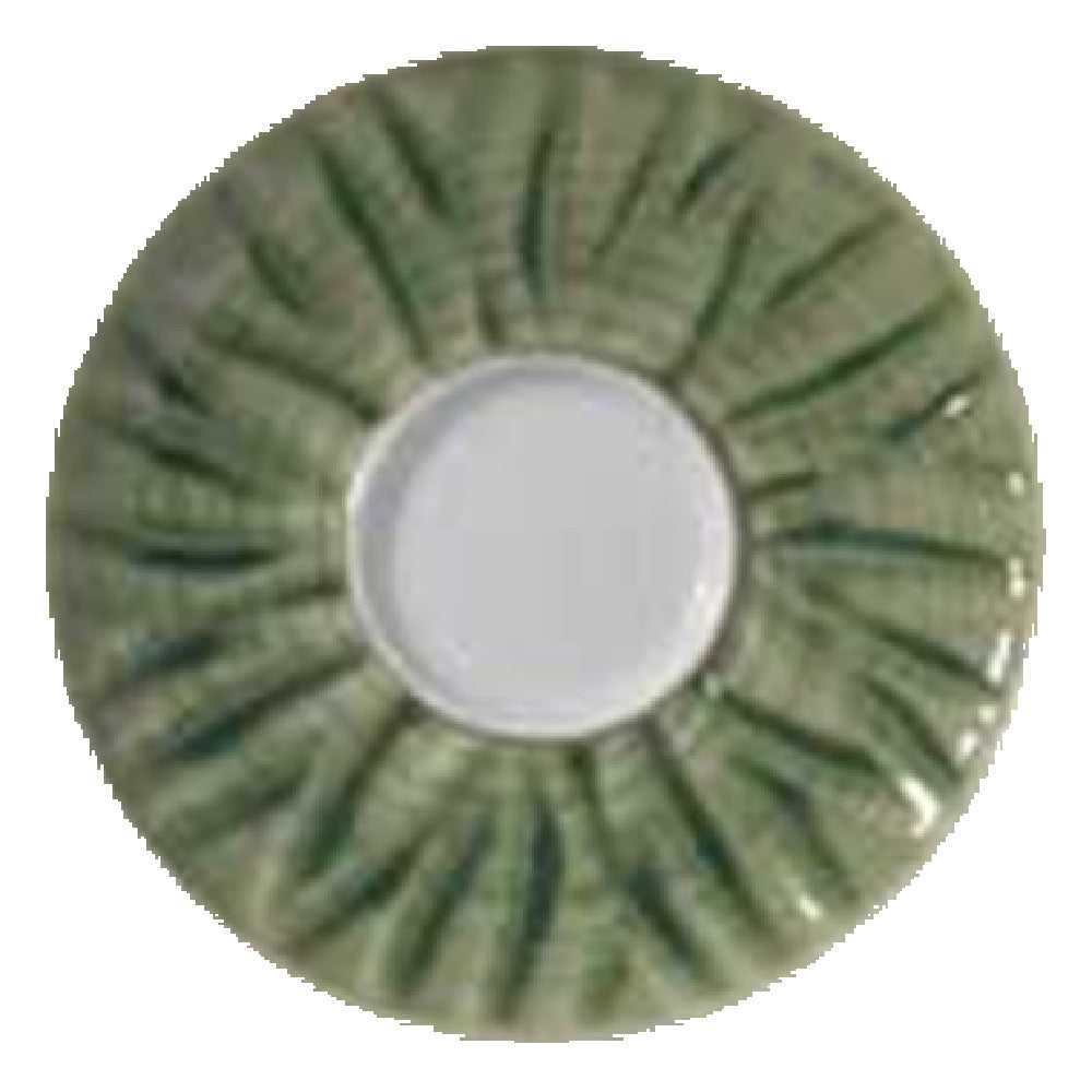 The Vertex China GV-36-G A.D. Saucer - 4-15/16" Dia. Round is a meticulously crafted piece from the Premium Euro Collection, designed to meet the diverse needs of the food service industry. With its precise dimensions of 4-15/16 inches in diameter, this round saucer is an ideal choice for both casual and upscale dining experiences. The saucer features a distinct embossed design that adds an element of sophistication, while the polished foot ensures stability and elegance in presentation. Made entirely of bright white porcelain, it offers a classic and timeless look, suitable for a variety of dining settings, from restaurants to catering events. The Vertex China GV-36-G is packed by 3 dozen per case, making it a practical option for establishments seeking to maintain a consistent and premium tabletop aesthetic. Part of the Grass Valley Water Colors collection, this saucer in the cilantro variant provides a touch of color, enhancing the visual appeal of any dining arrangement. Its durable construction ensures longevity, making it a valuable addition to any food service operation looking to maintain a high standard of service and presentation.
