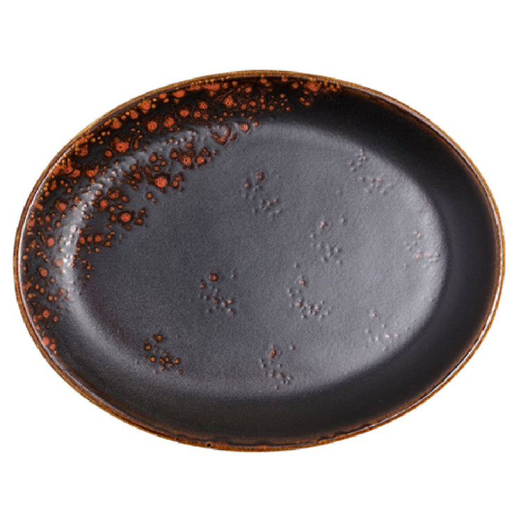 The Vertex China LMC-13 Platter 11" Oval is a sophisticated piece from the Premium London Moonstone Collection, exemplifying both style and durability in tableware. This 11-inch oval platter is thoughtfully designed with a coupe shape, showcasing a hand-painted, matte black and terra cotta reactive glaze that adds a unique aesthetic to any dining setting. The platter's fully glazed foot ensures a smooth finish that resists scratches, maintaining a pristine appearance even with frequent use. Engineered with an aluminum oxide reinforced body, it offers enhanced durability, making it well-suited for both everyday use and high-volume environments. Crafted from high-quality porcelain, the platter is ideal for restaurants, catering services, and upscale dining establishments looking to elevate their presentation. Its ability to withstand the rigors of commercial use without compromising on design makes it a valuable investment for various market segments within the hospitality industry. The Vertex China LMC-13 Platter is packed by the dozen, catering to the needs of businesses that require premium dinnerware in larger quantities. This combination of artistic design and robust construction ensures that it not only complements any meal but stands the test of time in demanding environments.