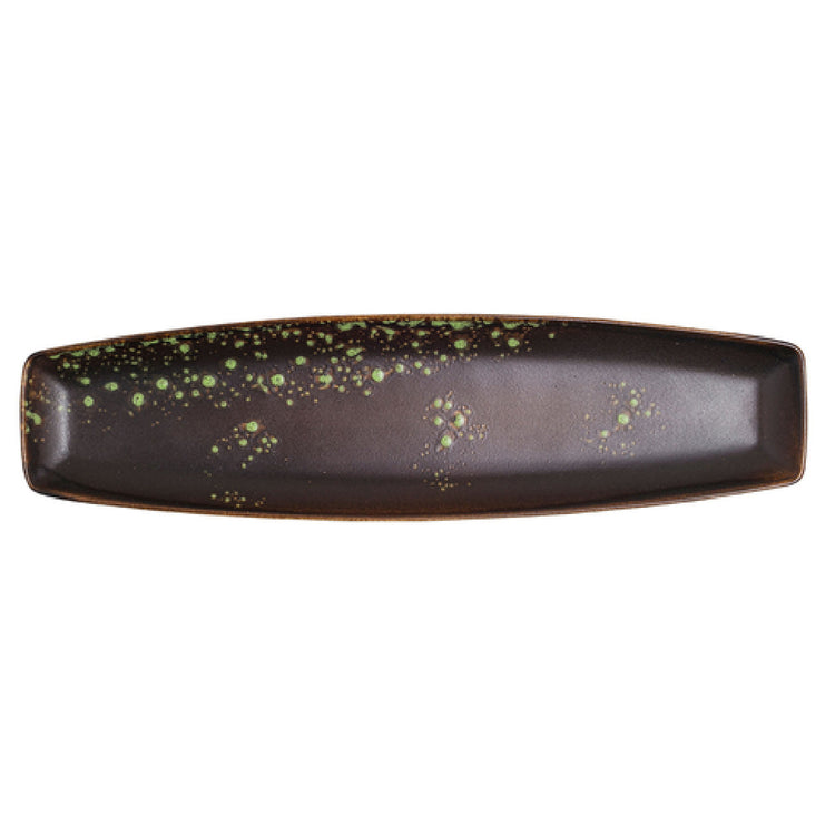 The Vertex China LMJ-O14 Platter 13" x 3-1/2" is a meticulously designed piece, distinguished by its oblique/rectangular shape. Part of the Premium London Moonstone Collection, this platter is crafted from high-quality porcelain, underscored by an aluminum oxide reinforced body which ensures durability and scratch resistance. The platter's hand-painted design, coupled with a matte black/jade reactive glaze, adds an element of sophistication, making it a striking addition to any table setting. Its fully glazed foot not only enhances its aesthetic appeal but also provides stability and protection to surfaces. This platter is particularly suitable for upscale dining establishments, catering services, and hotel banquet settings, where presentation and durability are paramount. Packed by 2 dozen per case, it caters to the demands of high-volume commercial environments, offering consistency in both style and function. The Vertex China LMJ-O14 Platter is a testament to fine craftsmanship and thoughtful design, providing an elegant solution for those seeking both form and function in their serving ware.