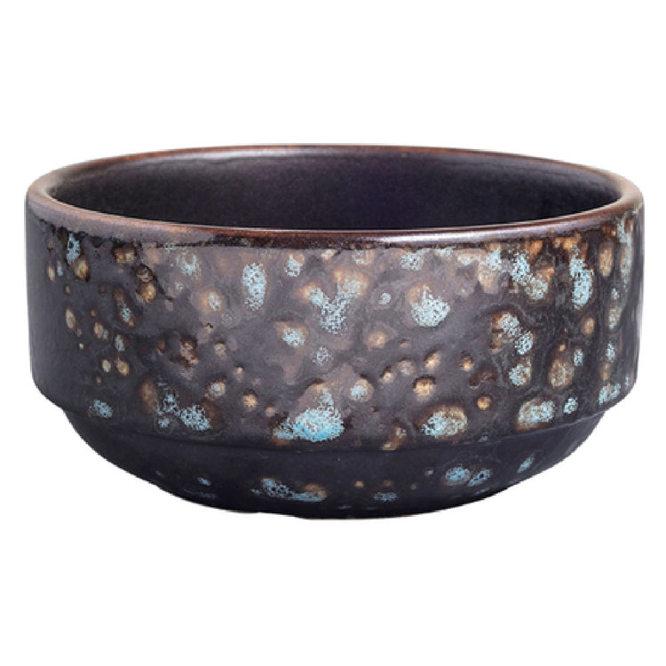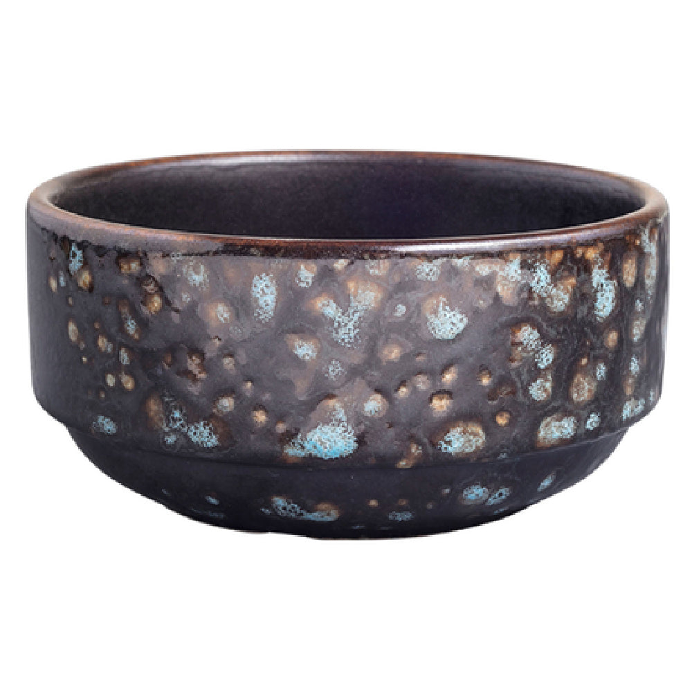 The Vertex China LMS-4S Bouillon 10 Oz. 4-5/16" is a versatile and elegantly designed dish from the Premium London Moonstone Collection, tailored for both aesthetic appeal and practical functionality within the food service industry. This round bouillon bowl features a generous 10 oz. capacity, providing ample space for various culinary creations. Its dimensions include a precise 4-5/16" width, making it an ideal fit for both intimate dining settings and larger banquet environments. The bowl is hand painted with a matte black and sky blue reactive glaze, a unique characteristic that enhances its visual appeal. Made from porcelain and reinforced with aluminum oxide, this bouillon is highly durable and scratch resistant, ensuring long-lasting use even in high-traffic settings. Its stackable design allows for convenient storage, optimizing space efficiency. The fully glazed foot adds an extra layer of protection and stability, preventing unnecessary wear on contact surfaces. This product is packaged by 3 dozen per case, catering to the demands of commercial kitchens, hotels, and restaurants that require both style and substance in their tableware. The Vertex China LMS-4S Bouillon embodies a seamless blend of modern aesthetics and robust utility, making it a noteworthy addition to any professional culinary environment.