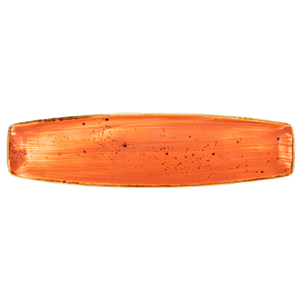 The Vertex China LTC-O14 Platter, measuring 13 inches by 3-1/2 inches, is a distinctive oblique/rectangular serving piece from the Premium London Terra Collection. This platter is meticulously hand-painted, showcasing an artisanal touch that adds elegance to any dining setting. It features a fully glazed foot, ensuring stability and preventing scratches on surfaces. Crafted with an aluminum oxide reinforced body, this platter is designed for durability and long-lasting use, making it a practical choice for high-volume commercial environments. The use of terra cotta not only enhances its aesthetic appeal but also contributes to its robust construction. This product is packed by 2 dozen per case, making it an efficient solution for catering services, restaurants, or hospitality establishments that require bulk quantities. The Vertex China LTC-O14 Platter combines functionality with style, catering to diverse market segments by offering a high-quality, aesthetically pleasing option for presentation and service. Its unique shape and design make it suitable for contemporary settings looking to make a statement with their tableware.