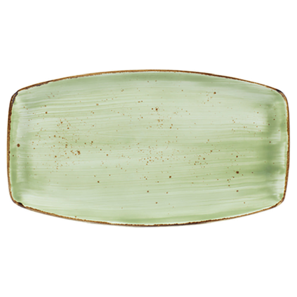 The Vertex China LTJ-O114 Platter is a meticulously crafted serving piece measuring 13 inches by 7 inches, characterized by its unique oblique-rectangular shape. This platter is part of the esteemed London Terra Collection, known for its premium quality and exquisite design. The platter features a fully glazed foot, enhancing its aesthetic appeal and providing a smooth finish, which ensures it does not scratch surfaces. This product is hand-painted, adding a touch of artisanal craftsmanship to each piece, making it a standout choice for upscale dining experiences. The body of the platter is reinforced with aluminum oxide, a material that enhances its durability and resistance to wear, making it suitable for frequent use in high-demand environments such as restaurants and catering services. The terra jade color of the platter exudes a sophisticated earthy tone, ideal for presenting a variety of cuisines with elegance. Packaged by the dozen, the Vertex China LTJ-O114 Platter is an excellent choice for establishments looking to maintain a consistent and refined table setting. This product's blend of robust construction and stylish design makes it a versatile addition to any dining service looking for both functionality and aesthetic appeal.