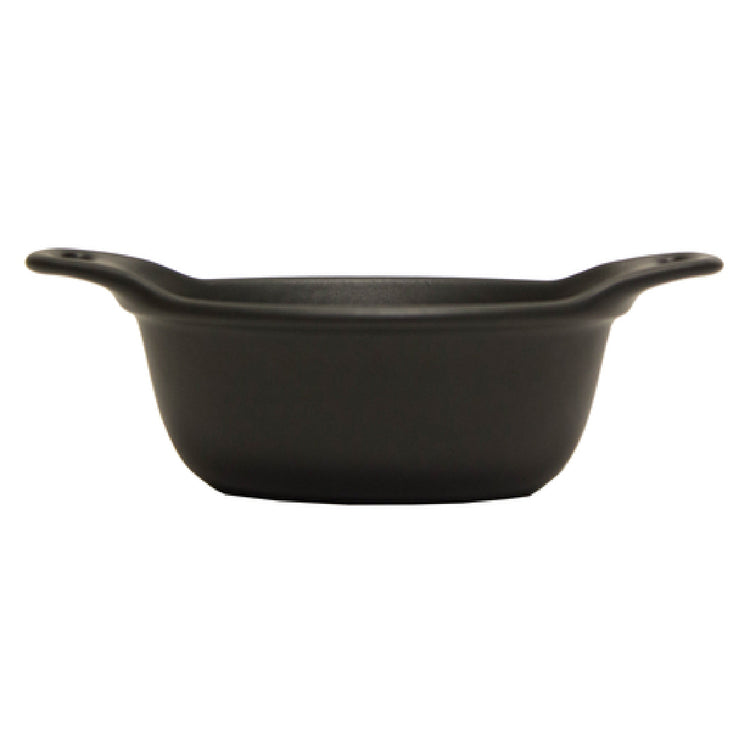 The Vertex China OB-OBK Mini Baker 3 Oz. 3-1/2" is a versatile and compact solution tailored for the culinary industry, featuring an elegant oval design with handles for easy maneuverability. This mini baker is crafted from premium porcelain, ensuring a high standard of durability and a matte black finish that enhances its aesthetic appeal. Its scratch-resistant quality makes it ideal for high-volume environments where maintaining a pristine appearance is crucial. The product is designed to withstand the rigors of daily use, being microwave, oven, freezer, and dishwasher safe, which adds to its versatility in both preparation and serving within various hospitality settings. With a capacity of 3 oz. and dimensions of 3-1/2", it offers the perfect portion control for individual servings, catering to the needs of restaurants, cafes, and catering services looking to elevate their dining experience with stylish and functional serveware. The inclusion of handles not only adds to the convenience but also enhances safety in handling hot dishes. Packed by 3 dozen per case, the Vertex China OB-OBK Mini Baker offers a practical and efficient solution for large-scale operations, ensuring consistency and quality across every dish served.