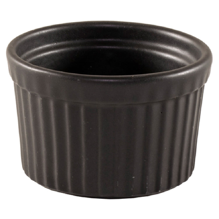The Vertex China RMK-4-BP Ramekin 3 Oz. 3-1/8" Dia. X 2"H is a premium-quality serving dish ideal for various culinary settings, from high-end restaurants to casual dining. This ramekin is crafted from durable porcelain, ensuring excellent scratch resistance that makes it a long-lasting addition to any kitchen. Its matte black finish, part of the Premium Organics Obsidian collection, offers a sophisticated aesthetic suitable for modern table settings. The ramekin's round shape and fluted sides add a touch of elegance while enhancing grip and handling. Measuring 3-1/8 inches in diameter and 2 inches in height, it provides a compact yet versatile 3-ounce capacity, perfect for serving individual portions of sauces, sides, or desserts. Additionally, the Vertex China RMK-4-BP ramekin is designed for convenience, being microwave, oven, freezer, and dishwasher safe, which makes it adaptable to a variety of food service operations. Its pack size of three dozen per case is ideal for establishments requiring bulk purchases. This product's combination of durability, style, and practicality makes it an exceptional choice for chefs and restaurateurs seeking reliable and attractive presentation solutions in their establishments.