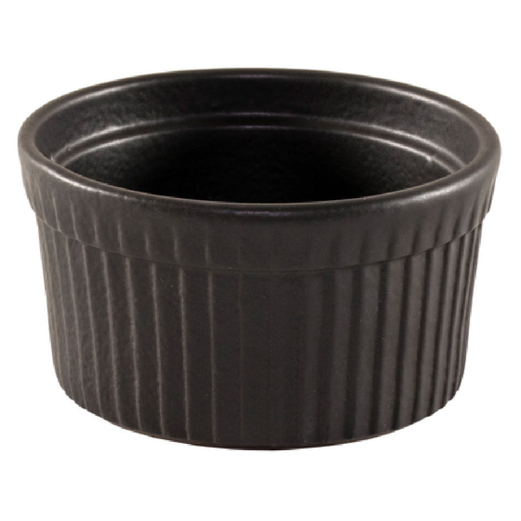 The Vertex China RMK-6-BP Ramekin 4 Oz. is a meticulously designed dish, perfect for a variety of culinary applications. With a 3-3/8" diameter and a height of 2", this round ramekin features elegantly fluted sides, combining form with function. Made from premium porcelain, its matte black finish is part of Vertex China’s Organics line, particularly within the Obsidian collection, offering a sophisticated aesthetic suitable for upscale dining settings. Its porcelain construction ensures that the ramekin is scratch-resistant, maintaining its pristine appearance even after extensive use. Designed for versatility, this ramekin supports microwave, oven, freezer, and dishwasher use, making it an adaptable choice for diverse food service environments. The product's robust build, along with its capacity to hold 4 ounces, makes it suitable for serving individual portions, enhancing the presentation of desserts, appetizers, or condiments. This ramekin comes packed in cases of three dozen, making it an efficient option for restaurants, catering services, and hospitality venues looking to elevate their tableware collection with durable, yet stylish, dishware. Its unique combination of aesthetic appeal and practical durability underscores its value proposition across different market segments in the food service industry.