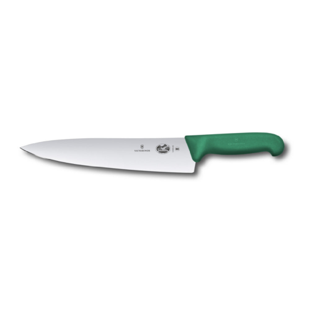 The Victorinox 5.2004.25 Chef's Knife - 10" Blade 2-1/4" Width At Handle is a precision-engineered tool ideal for both professional chefs and culinary enthusiasts. With a substantial 10-inch blade, this knife provides the leverage and length necessary for efficient cutting and slicing tasks in the kitchen. The blade's width at the handle is 2-1/4 inches, offering a balanced grip and enhancing control during use. The knife is equipped with a distinctive green Fibrox® Pro handle, which is slip-resistant, ensuring safety and ease of use even when wet, making it particularly valuable in busy kitchen environments. Certified by NSF, this knife meets high public health and safety standards, making it suitable for commercial kitchens. Its ergonomic design and enduring quality make it a versatile essential for various culinary applications, from slicing vegetables to carving meats, serving different segment markets, including professional kitchens and cooking schools, as well as home cooks who value precision and reliability in their kitchen tools.