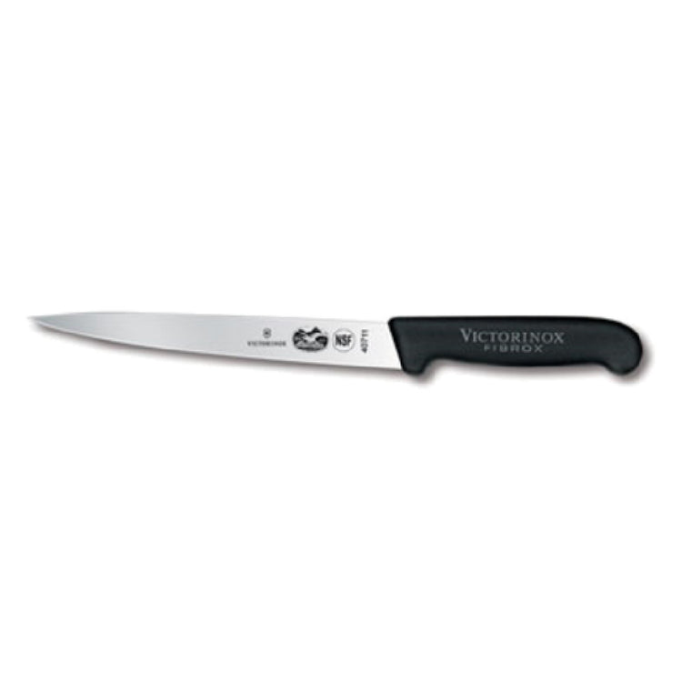 The Victorinox 5.3703.20 Fillet Knife 8" Semi-flexible Blade Black Fibrox® Pro Handle is a highly specialized tool engineered for precision and control in various culinary settings. Featuring an 8-inch semi-flexible blade, this knife is adept at delivering detailed and delicate cuts, making it an indispensable instrument for chefs and fishmongers who require the utmost accuracy when filleting. The blade's semi-flexibility offers a balance between rigidity and pliability, enabling efficient maneuverability around bones and joints. Enhanced with a Black Fibrox® Pro handle, the knife offers a slip-resistant grip, ensuring safety and comfort even in wet conditions. This ergonomic handle is designed to minimize hand fatigue, making it ideal for prolonged use in professional kitchens. The knife is NSF certified, signifying its adherence to stringent public health and safety standards, making it a reliable choice for institutional and commercial food service environments. Whether used in a bustling restaurant, a seafood market, or for personal culinary projects, the Victorinox 5.3703.20 Fillet Knife stands out as a versatile and dependable tool, providing precision, safety, and durability tailored to the diverse needs of the industry professionals and culinary enthusiasts alike.