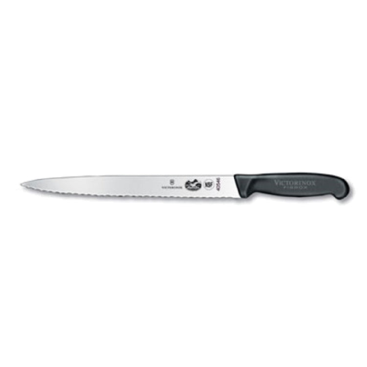 The Victorinox 5.4433.25 Slicer Knife - 10" Blade, Semi-flexible is a precision culinary tool renowned for its durability and versatility, catering to different market segments within the food industry. Featuring a 10-inch semi-flexible blade, this slicer knife is designed with a pointed blade and a wavy edge, ensuring precision and ease while slicing through various food textures effortlessly. With a width of 1-1/8" at the handle, it offers a comfortable grip for enhanced control during use. The knife’s black Fibrox® Pro handle is slip-resistant, providing safety and reducing the risk of accidents in fast-paced kitchen environments. Certified by NSF, this slicer knife aligns with public health and safety standards, making it a trusted choice for professional chefs and home cooking enthusiasts alike. Its unique combination of flexibility and precision makes it an indispensable tool for tasks ranging from delicate slicing to robust cutting in restaurants, catering services, and home kitchens. The Victorinox 5.4433.25 Slicer Knife is engineered to enhance the efficiency and quality of food preparation, making it a valuable addition to any culinary toolkit.