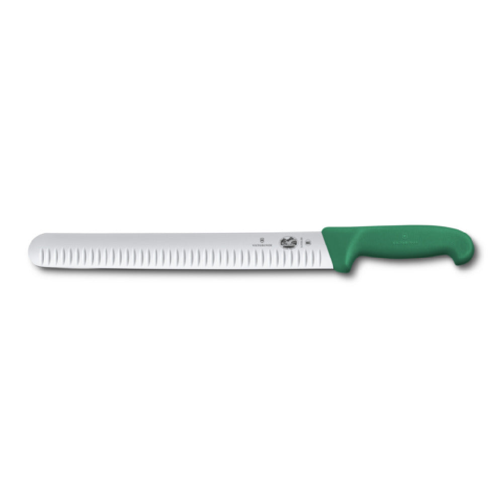 The Victorinox 5-4724-30 Slicer Knife 12" Wide Blade 1-1/4" Width At Handle is a precision-crafted tool designed for professional and home chefs who value efficiency and quality in their kitchen instruments. This slicer knife features a 12-inch wide blade equipped with a granton edge, which enhances slicing performance by reducing friction and preventing food from sticking to the blade. The blade's generous width of 1-1/4 inches near the handle provides excellent control and stability during use, catering to both commercial culinary environments and personal kitchens. The knife is complemented by a green Fibrox® nylon handle, known for its slip-resistant properties, ensuring safety and comfort even during extended use. Moreover, the handle's ergonomic design aids in minimizing wrist fatigue, making it suitable for high-volume operations. Certified by NSF, this slicer knife meets rigorous public health and safety standards, endorsing its application in professional settings. The Victorinox 5-4724-30 Slicer Knife is particularly valued in markets such as catering, hospitality, and restaurant industries, where precision and durability are paramount. Whether for slicing meats, fruits, or vegetables, this knife stands out with its robust design and professional-grade performance.