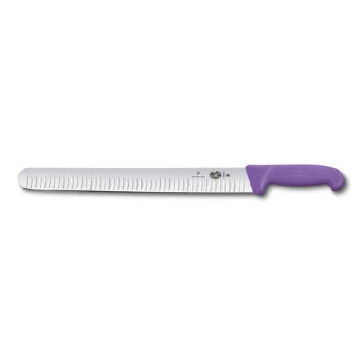 The Victorinox 5.4725.36 Slicer Knife is an expertly crafted culinary tool, featuring a 14-inch wide blade and a 1-1/2-inch width at the handle, ideal for precision slicing applications. This knife is designed with a granton edge, which aids in reducing friction and preventing food from sticking to the blade, enhancing efficiency in professional kitchen environments. The vibrant purple Fibrox® nylon handle is not only aesthetically unique but also engineered to be slip resistant, providing a secure grip even in wet or oily conditions. This makes it a reliable choice for chefs and culinary professionals who prioritize safety and comfort during extended use. The knife's NSF certification assures compliance with stringent public health and safety standards, making it suitable for commercial use in diverse food industry segments, from fine dining establishments to bustling catering services. With its robust construction and thoughtfully designed features, the Victorinox 5.4725.36 Slicer Knife embodies a blend of functionality and innovation, perfectly suited to meet the demands of professional chefs and kitchen enthusiasts alike.