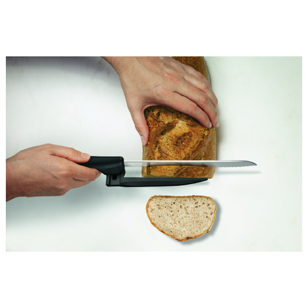 The Victorinox 6.8663.21 Dux Knife is a high-performance culinary tool featuring an 8-1/4 inch blade crafted for precision and efficiency. This knife is equipped with a serrated edge, making it particularly effective for slicing through items with tough exteriors and soft interiors, such as bread or fruits. The blade is stamped, a manufacturing technique that ensures a lightweight profile and sharp edge, catering to the needs of professionals and home cooks alike. Complementing the blade is a sleek black handle designed for comfort and control, ensuring a secure grip during use. This knife is particularly suitable for chefs, culinary students, and cooking enthusiasts who value both functionality and design. Its technical specifications make it a versatile addition to any kitchen, providing a reliable tool for various slicing tasks. The Victorinox 6.8663.21 Dux Knife is a testament to Swiss craftsmanship, offering users a blend of durability and practicality. Its design caters to the demands of both commercial kitchens and home cooking environments, making it a valuable asset across different segments of the culinary industry.