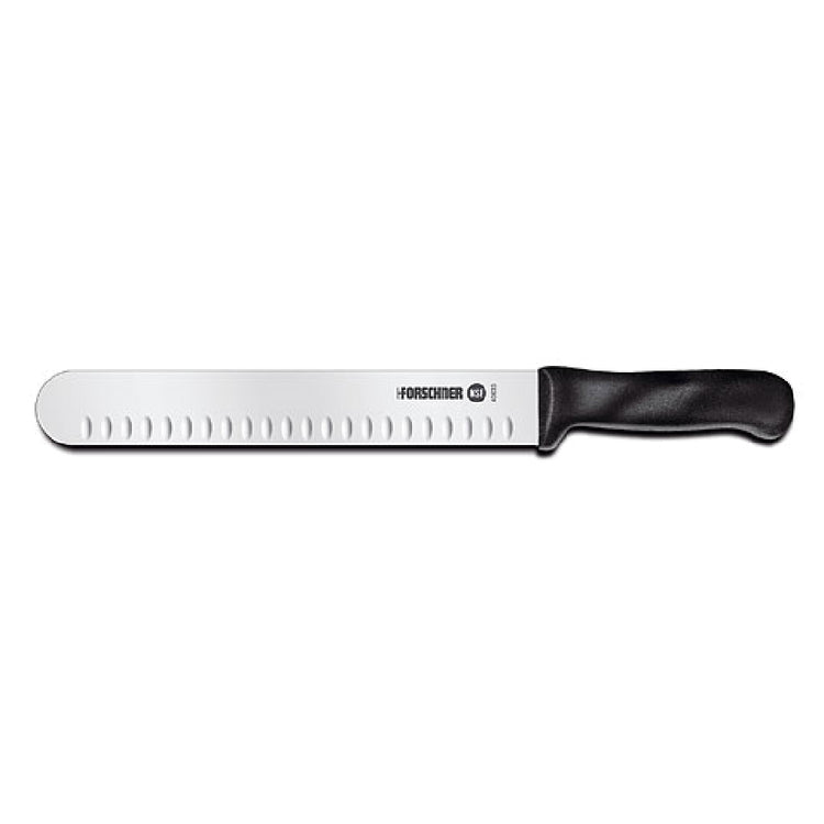 The Victorinox 7.6059.13 Slicer Knife is a precision tool designed for efficiency and performance in the culinary industry. With a 10-inch blade and a 1-1/2-inch width at the handle, this slicer knife is engineered for optimal slicing capabilities. The blade features a granton edge, which is instrumental in reducing friction and preventing food from sticking, thus ensuring smooth and precise cuts. This design is particularly advantageous for professionals slicing large quantities of meat or delicate ingredients. The polypropylene handle adds durability and comfort, providing a secure and ergonomic grip for extended use. This slicer knife is tailored for diverse market segments such as professional chefs, caterers, and home cooking enthusiasts seeking reliable kitchen tools. Its combination of size, edge design, and handle material make it a valuable asset in any kitchen setting, offering a balance of form and function that meets the demands of rigorous kitchen environments. The Victorinox 7.6059.13 Slicer Knife is a testament to quality craftsmanship and practical design, making it a preferred choice for those who prioritize precision and ease of use in their culinary toolkit.
