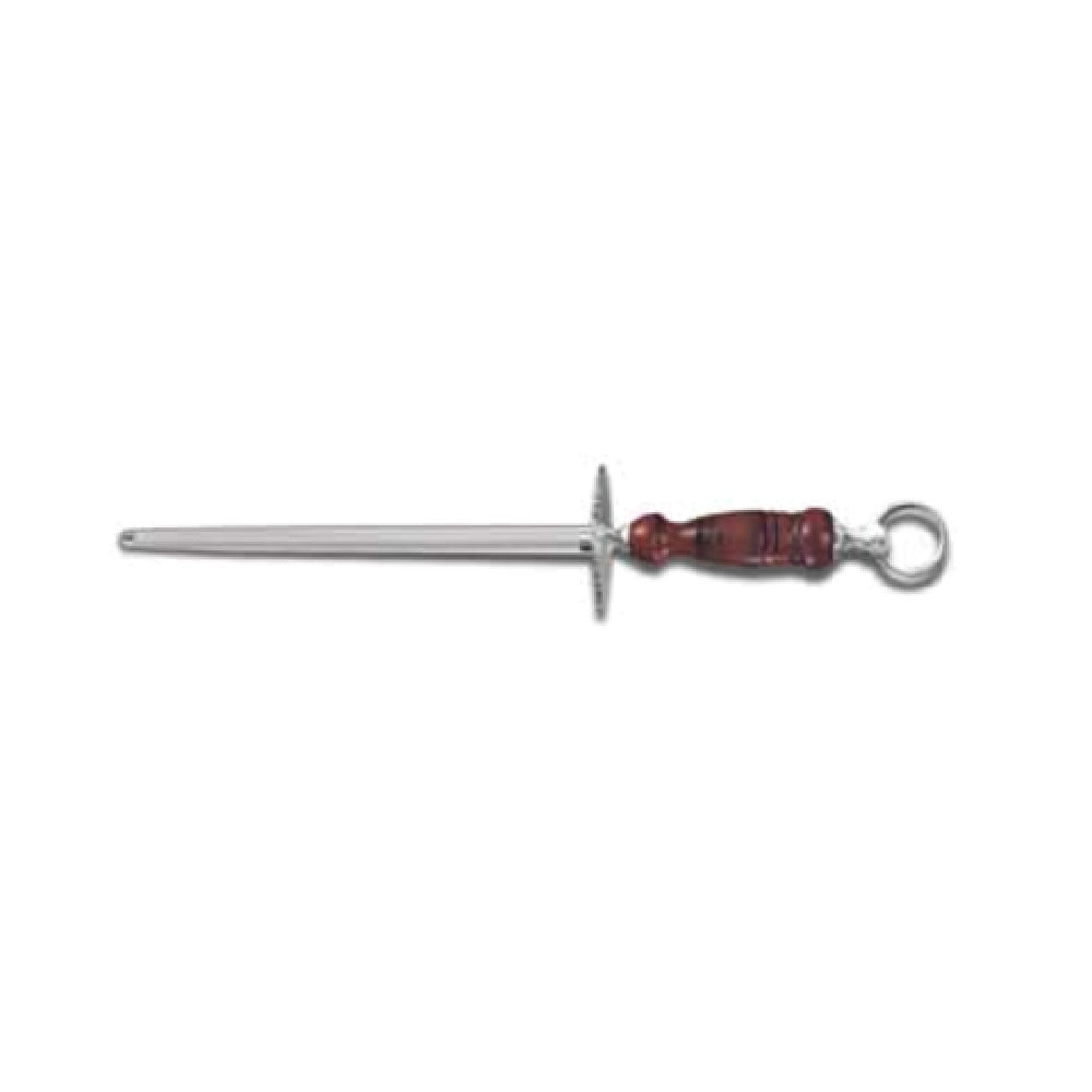 The Victorinox 7.8991.22 Sharpening Steel - 10" Regular Cut Round is a precision tool designed for maintaining the edge of your knives with excellence. It features a 10-inch round steel surface with a regular cut, providing an ideal balance for both fine and coarse sharpening tasks. This sharpening steel is equipped with a dark wood handle, offering both aesthetic appeal and ergonomic comfort for extended use. The inclusion of a loose ring allows for convenient storage and accessibility, making it a practical addition to any kitchen or professional culinary environment. The hangtag provides easy identification and branding, ensuring that this tool stands out in its category. Crafted by Victorinox, a name synonymous with quality and reliability, this sharpening steel is engineered to cater to diverse market segments, from home cooks to professional chefs, who demand precision and durability in their sharpening tools. Its robust construction and superior design make the Victorinox 7.8991.22 a valuable asset for maintaining the sharpness and longevity of your knives, ensuring cutting-edge performance across a variety of culinary tasks. This product exemplifies Victorinox's commitment to quality and craftsmanship, serving as a reliable and efficient tool for all your sharpening needs.
