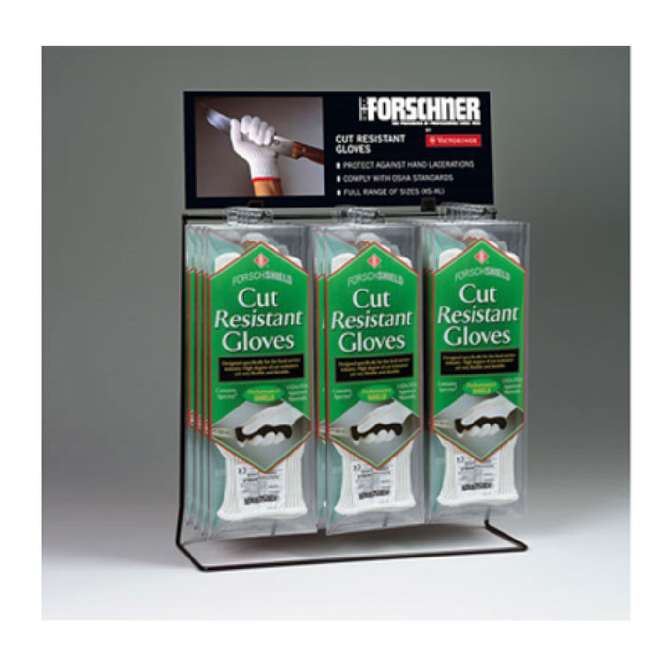 The Victorinox V0000856 Performance Shield 2 Glove Display Set is a comprehensive solution designed for showcasing and organizing protective gloves in a retail or professional setting. Measuring 13-3/4" x 5" x 18-3/4", this display set includes a header card and a 3-peg wire rack, providing a structured and attractive presentation format. The set is thoughtfully curated with a wide range of glove sizes to suit various customer needs: 4 pairs of X-small (7.9045.XS), 8 pairs of small (7.9045.S), 12 pairs of medium (7.9045.M), 8 pairs of large (7.9045.L), and 4 pairs of X-large (7.9045.XL) gloves. This detailed assortment ensures that customers from different market segments, such as culinary professionals, industrial workers, or home users, can find the perfect fit for their protective needs. The Victorinox V0000856 is designed to enhance both the visibility and accessibility of Performance Shield 2 Gloves, making it an invaluable asset for businesses aiming to provide high-quality protective gear. Its durable construction and efficient design serve to maximize space utilization while maintaining an organized and professional appearance, which is essential for retail environments looking to optimize customer interaction and satisfaction.