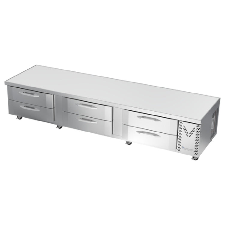 The Victory CBR112HC Chef Base Refrigerator Powered By V-Core™ Three-section is a versatile and efficient refrigeration solution designed for professional kitchens. With a substantial width of 112 inches and a self-contained system, this refrigerator provides a generous capacity of 24.36 cubic feet. It features six drawers, strategically placed to enhance accessibility - the left and right side drawers are built to fit two 12" x 20" x 6" pans each, while the center drawers accommodate three pans of the same size. This robust chef base is equipped with full electronic controls for precise temperature management. Its stainless steel exterior, complemented by a galvanized back and bottom, ensures durability and resilience in demanding environments. The aluminum interior is paired with magnetic gaskets that come with a 2-year warranty, emphasizing the product's reliability. Utilizing the R290 hydrocarbon refrigerant and powered by a 1/3 HP motor, it is an environmentally friendly choice that meets cULus, UL EPH Classified, and UL-Sanitation standards. The side-mounted refrigeration system further optimizes the unit's functionality. Proudly made in the USA, the Victory CBR112HC Chef Base Refrigerator is an exemplary choice for culinary professionals seeking efficiency, capacity, and sustainability in their refrigeration needs.