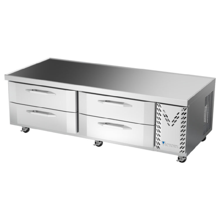 The Victory CBR72HC Chef Base Refrigerator Powered By V-Core™ Two-section is a top-tier refrigeration solution crafted for professional kitchens. With a generous 14.51 cubic feet capacity, this unit measures 72 inches in width and features a two-section design, providing ample storage space for culinary operations. The refrigerator is equipped with four robust drawers, each capable of accommodating up to two 12" x 20" x 6" pans, making it versatile for various storage needs. The stainless steel exterior, complemented by a galvanized back and bottom, ensures durability and a sleek appearance, while the aluminum interior supports efficient refrigeration. This model boasts a full electronic control system, enhancing usability and precision. Designed with a side-mounted self-contained refrigeration system, it utilizes R290 hydrocarbon refrigerant, powered by a 1/3 HP compressor, ensuring efficient and environmentally friendly cooling. Magnetic gaskets come with a 2-year warranty, highlighting the product's reliability. Certified by cULus, UL EPH, and UL-Sanitation, the Victory CBR72HC upholds high safety and sanitation standards, and it is proudly made in the USA. This chef base refrigerator seamlessly blends advanced technology with practical design, tailored to meet the demands of bustling food service environments.