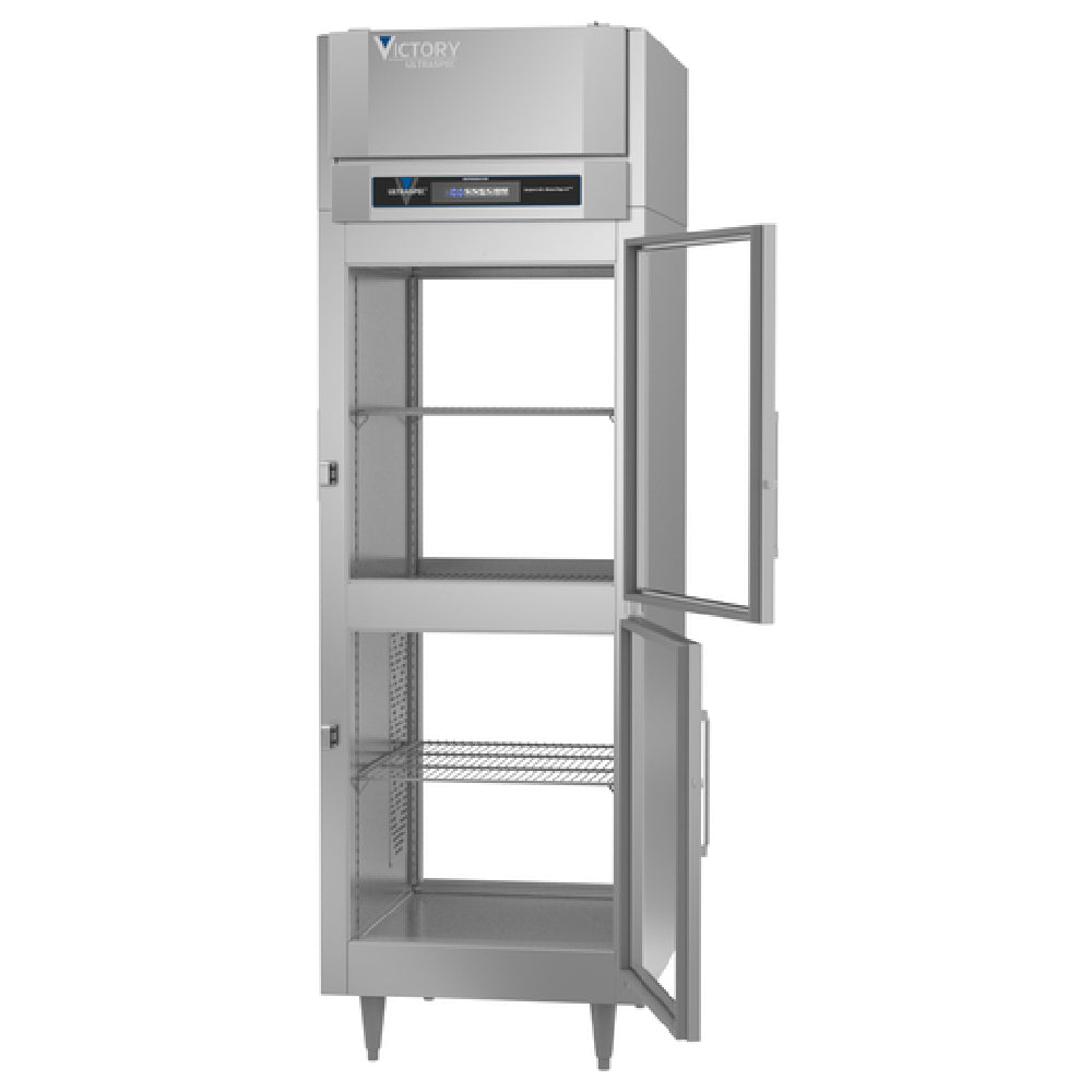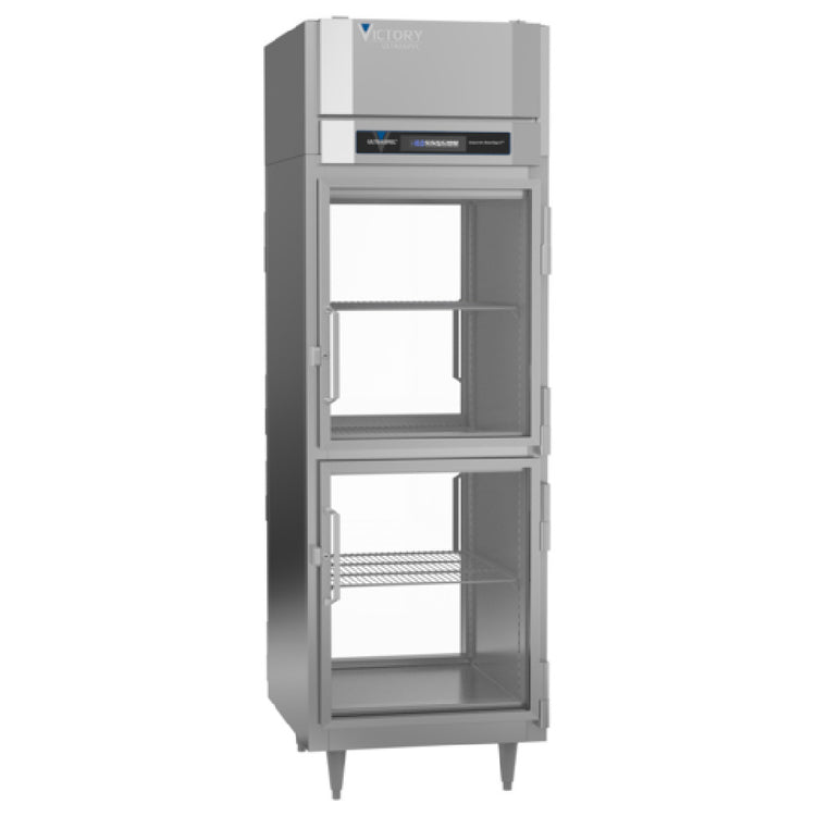 The Victory FSA-1D-S1-PT-HG-HC UltraSpec™ Series Freezer Powered By V-Core™ Pass-Thru is an industrial-grade refrigeration unit tailored for businesses that demand reliable and efficient cold storage solutions. This one-section, self-contained refrigeration unit boasts a 23.7 cubic feet capacity, making it suitable for various sectors within the food industry requiring robust storage capabilities. Equipped with four half-height hinged standard glass doors and three silver freeze shelves with a chrome-style finish, it offers both visibility and efficient organization of stored items. The exterior is constructed from durable stainless steel, while the interior is made from sturdy aluminum, ensuring longevity and ease of maintenance. The freezer's advanced TOUCH POINT™ electronic temperature control and indicator system facilitates precise temperature management, bolstered by energy-efficient LED lighting. Expansion valve technology enhances the overall cooling performance, while Santoprene door gaskets with a two-year warranty ensure airtight sealing. The unit's stainless steel breakers and a reliable 1/2 HP compressor further underscore its industrial reliability. Certified by cULus, UL EPH Classified, and UL-Sanitation, and proudly made in the USA, this freezer is a comprehensive solution designed for businesses that prioritize quality, efficiency, and regulatory compliance in their refrigeration systems.
