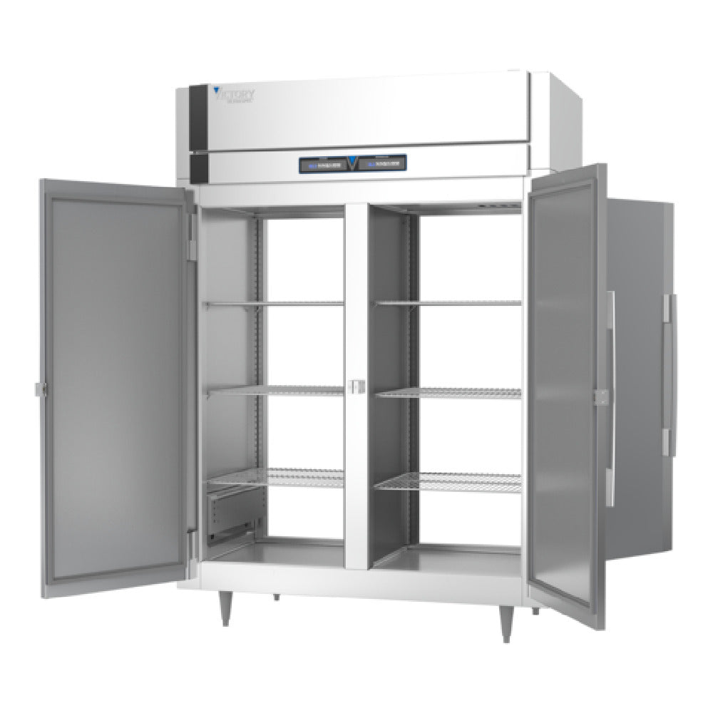 The Victory HRS-2D-S1-EW-PT-HC UltraSpec™ Series Dual Temp Warmer/Refrigerator Powered By V-Core™ is a cutting-edge appliance designed for versatile food storage solutions. Featuring a pass-thru design with two sections, it provides an impressive 25.6 cubic feet of capacity per section, accommodating diverse storage needs in commercial kitchens. The unit is equipped with four hinged doors and includes three silver freeze (chrome-style) shelves for each warmer and refrigerator section, ensuring organized storage. Constructed with a durable stainless steel exterior and interior, this appliance is built for longevity. The standard depth cabinet is complemented by wide full-height doors, facilitating easy access. The TOUCH POINT™ electronic temperature control and indicators offer precision temperature management, essential for maintaining optimal food quality. Powered by a top-mounted compressor with R-290 Hydrocarbon refrigerant, it offers an eco-friendly refrigeration solution with a 1/3 HP for the refrigerator section. This product is cULus, UL-EPH Classified, and UL-Sanitation certified, guaranteeing compliance with industry safety standards. Proudly made in the USA, the Victory UltraSpec™ Series Dual Temp Warmer/Refrigerator is an exceptional choice for restaurants, catering services, and institutional kitchens seeking reliable and efficient refrigeration and warming solutions.