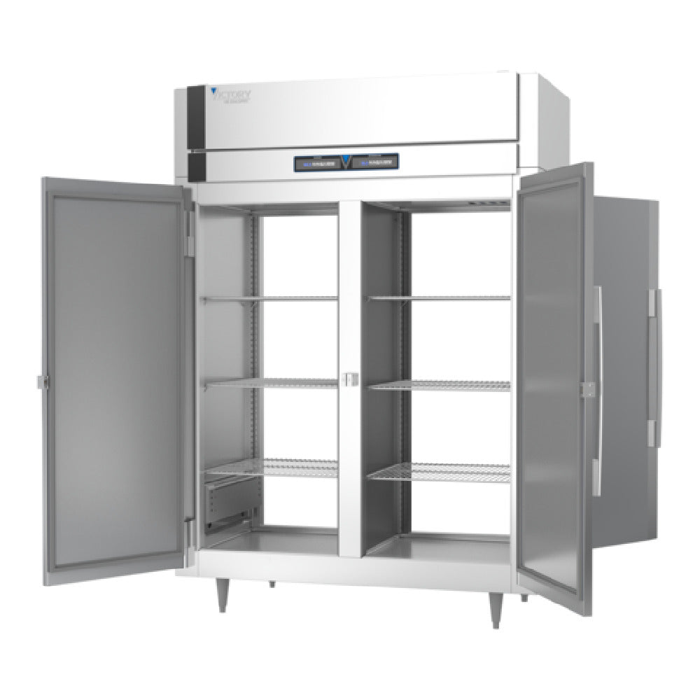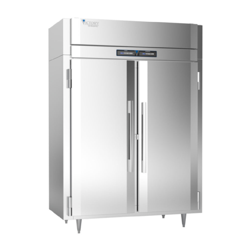 The Victory HRSA-2D-S1-EW-PT-HC UltraSpec™ Series Dual Temp Warmer/Refrigerator Powered By V-Core™ is an advanced, dual-function appliance designed for versatile storage solutions in various industry sectors. With a substantial capacity of 25.6 cu. ft. per section, this unit efficiently accommodates both warming and refrigeration needs, making it a valuable asset for settings demanding diverse temperature control. Featuring two sections with a pass-thru design, the appliance includes four hinged doors, providing convenient access from both sides. Each section is equipped with three silver freeze shelves, styled in chrome, optimizing organizational capabilities. Constructed from stainless steel on the exterior and aluminum on the interior, the unit promises durability and an easy-to-clean surface. It utilizes a top-mounted compressor powered by 1/3 HP for the refrigerator section and employs R-290 Hydrocarbon refrigerant, ensuring an environmentally friendly operation. The TOUCH POINT™ electronic temperature control provides precise temperature management, enhancing operational efficiency. Certified by cULus, UL-EPH Classified, and UL-Sanitation, the Victory HRSA-2D-S1-EW-PT-HC underscores its commitment to safety and reliability. Made in the USA, this dual temp warmer/refrigerator is a testament to quality craftsmanship, suitable for professional kitchens and food service operations seeking superior temperature control solutions.