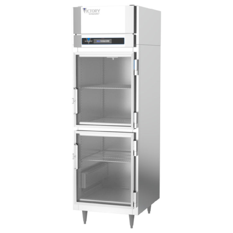 The Victory HSA-1D-1-HG UltraSpec™ Series Heated Cabinet Powered By V-Core™ Reach-in is a robust storage solution designed for various commercial applications. This one-section cabinet boasts a capacity of 21.5 cubic feet, making it ideal for environments that require precise and efficient heated storage. Featuring two half-height hinged standard glass doors, it provides easy access and visibility to stored contents. The cabinet comes equipped with three silver freeze (chrome-style) shelves, ensuring optimal organization and support for various items. Designed with a standard depth cabinet, this unit is constructed with a stainless steel exterior and an aluminum interior, ensuring durability and longevity. An exterior digital thermometer is included, offering accurate temperature monitoring at a glance. Security is enhanced with cylinder locks, safeguarding the contents within. The cabinet is UL and UL EPH Classified, underscoring its compliance with industry safety and quality standards. Proudly made in the USA, the Victory Heated Cabinet serves as a reliable and efficient solution for businesses seeking advanced heated storage capabilities, making it a valuable asset across different segments of the foodservice industry.