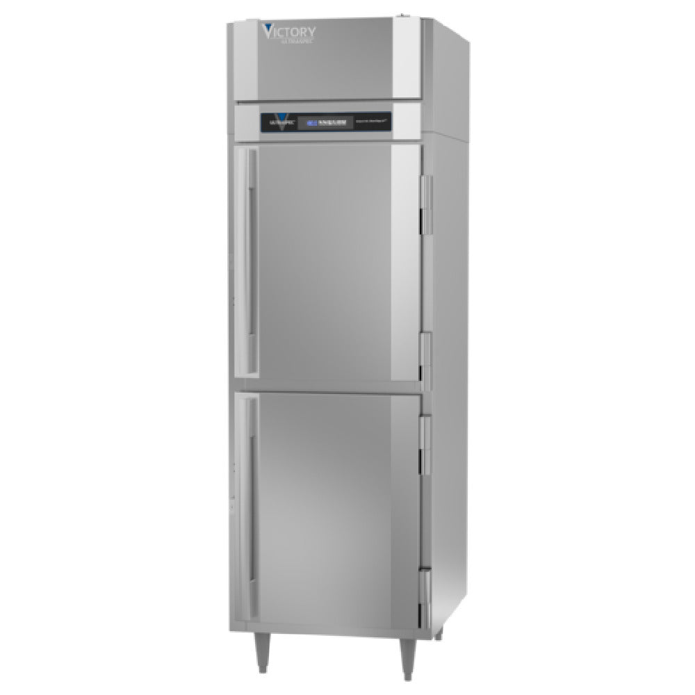 The Victory HSA-1D-1-PT-HD UltraSpec™ Series Heated Cabinet Powered by V-Core™ represents a pinnacle of storage technology for professional food service operations. This one-section, pass-thru cabinet boasts a substantial capacity of 21.5 cubic feet, providing ample space for various storage needs. It features four half-height solid hinged doors designed for convenient access and effective temperature retention. The cabinet is equipped with three silver freeze shelves, which resemble a chrome finish, offering durable and visually appealing storage solutions. Constructed with a stainless steel exterior and an aluminum interior, the cabinet ensures robust durability and ease of maintenance. The exterior digital TOUCH POINT™ control system offers intuitive operation, allowing for precise temperature adjustment and monitoring. Security is enhanced with cylinder locks on the doors, safeguarding contents effectively. Classified by UL and UL EPH, this heated cabinet adheres to stringent safety and quality standards, making it a reliable choice for commercial kitchens. Furthermore, it is proudly made in the USA, ensuring high manufacturing standards. The Victory HSA-1D-1-PT-HD is engineered for optimal performance in diverse culinary environments, offering both reliability and advanced technological features powered by V-Core™.