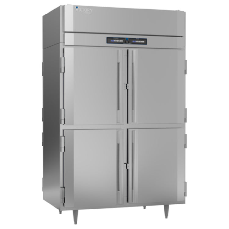 The Victory RFS-2D-S1-PT-HD-HC UltraSpec™ Series Refrigerator/Freezer Powered By V-Core™ is a versatile and robust refrigeration solution designed for the foodservice industry. This pass-thru, two-section unit provides a substantial 22.9 cubic feet capacity per section, accommodating a variety of storage needs with its eight half-height solid hinged doors. It includes six silver freeze (chrome-style) wire shelves for optimal organization. Constructed with a durable stainless steel exterior and interior, this refrigerator/freezer ensures longevity and reliability. The standard depth cabinet houses top-mounted compressors, with the refrigerator powered by a 1/3 HP motor and the freezer by a 3/4 HP motor, delivering efficient and powerful cooling. The TOUCH POINT™ electronic temperature control and indicators, coupled with LED lighting, offer precise temperature management and enhanced visibility. The expansion valve technology and Santoprene door gaskets, backed by a two-year warranty, highlight the product’s commitment to performance and quality. This unit is cULus, UL EPH Classified, and UL-Sanitation certified, ensuring it meets rigorous safety and sanitation standards. Proudly made in the USA, the Victory RFS-2D-S1-PT-HD-HC presents a premium choice for professional kitchens seeking reliable refrigeration solutions.