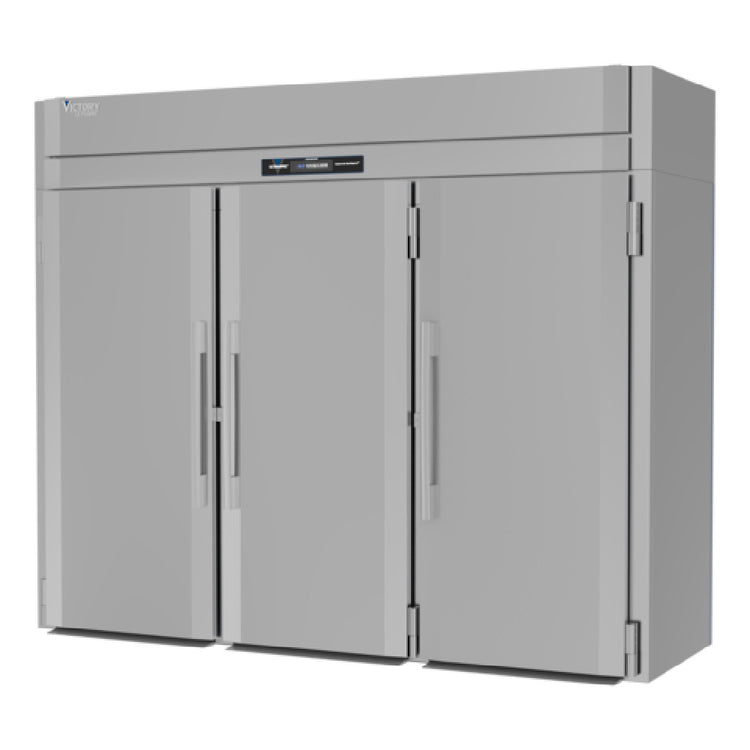 The Victory RIS-3D-S1-PT-HC UltraSpec™ Series Refrigerator Powered By V-Core™ is an advanced refrigeration solution designed to meet the needs of various industrial segments. This roll-thru, three-section refrigerator offers a substantial 118.3 cu. ft. capacity, making it well-suited for environments demanding significant storage space. Constructed with a stainless steel exterior and interior, it ensures durability and easy maintenance. The unit features a standard depth cabinet equipped with six full-height 20-gauge stainless steel doors, providing robust access and security. Its TOUCH POINT™ electronic temperature control/indicator enhances operational efficiency by maintaining optimal storage conditions. LED lighting is integrated for energy-efficient illumination, while the expansion valve technology ensures precise temperature regulation. The Santoprene door gaskets come with a 2-year warranty, reflecting the product's quality commitment. Featuring stainless steel breakers and a ramp, the unit incorporates two 1/3 HP motors for reliable performance. It is cULus, UL-Sanitation, and UL EPH Classified, underscoring its compliance with industry standards. Proudly made in the USA, the Victory RIS-3D-S1-PT-HC UltraSpec™ Series Refrigerator represents a premium choice for those seeking a high-capacity, durable, and efficient refrigeration system.