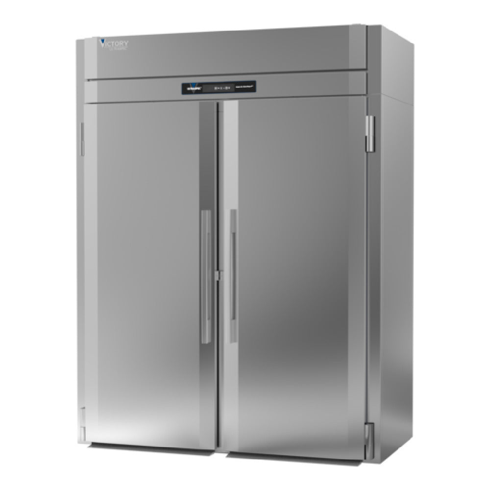 The Victory RISA-2D-S1-PT-XH-HC UltraSpec™ Series Refrigerator Powered By V-Core™ is an advanced refrigeration solution designed for optimal efficiency and capacity in commercial settings. This roll-thru, two-section refrigerator boasts an impressive 85.76 cubic feet of storage space, making it suitable for large-scale operations. Its robust construction features a stainless steel exterior and an aluminum interior, ensuring durability and longevity. The unit is equipped with four extra-high 20-gauge stainless steel doors, providing easy access while maintaining temperature stability. Featuring TOUCH POINT™ electronic temperature control and indicator, the refrigerator offers precise management of internal conditions. Enhanced by LED lighting, it facilitates easy visibility of contents. Its expansion valve technology optimizes the refrigeration process for improved performance. For added reliability, the Santoprene door gaskets come with a two-year warranty, and stainless steel breakers contribute to the unit's durability. The inclusion of a stainless steel ramp allows for effortless loading and unloading. With a 3/4 HP compressor, the refrigerator ensures powerful cooling capabilities. The unit is cULus, UL-Sanitation, and UL EPH Classified, emphasizing its compliance with industry standards. Proudly manufactured in the USA, the Victory UltraSpec™ Series Refrigerator is a prime choice for businesses requiring high-capacity, reliable refrigeration solutions.