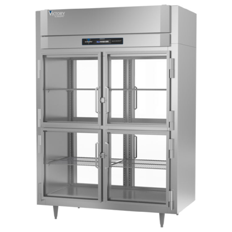 The Victory RS-2D-S1-EW-PT-HG-HC UltraSpec™ Series Refrigerator Powered By V-Core™ is a highly advanced refrigeration unit, featuring a pass-thru two-section design with a self-contained refrigeration system. It boasts a substantial 55.6 cubic feet capacity, making it suitable for various industrial applications. The refrigerator is equipped with eight wide half-height hinged standard glass doors, complemented by six silver freeze chrome-style shelves, ensuring ample storage and organization. Its stainless steel exterior and interior provide durability and a sleek appearance. The standard depth cabinet is enhanced with TOUCH POINT™ electronic temperature control and indicator for precise temperature management. LED lighting is included for enhanced visibility. The unit employs expansion valve technology and features Santoprene door gaskets, which come with a two-year warranty. Stainless steel breakers contribute to the refrigerator's robust construction. Powered by a 3/4 HP motor, this refrigerator is UL, cUL, and UL EPH Classified, ensuring compliance with safety and performance standards. Proudly made in the USA, the Victory RS-2D-S1-EW-PT-HG-HC UltraSpec™ Series Refrigerator stands out in the market for its reliable performance and advanced features, catering to different segment markets within the refrigeration industry.