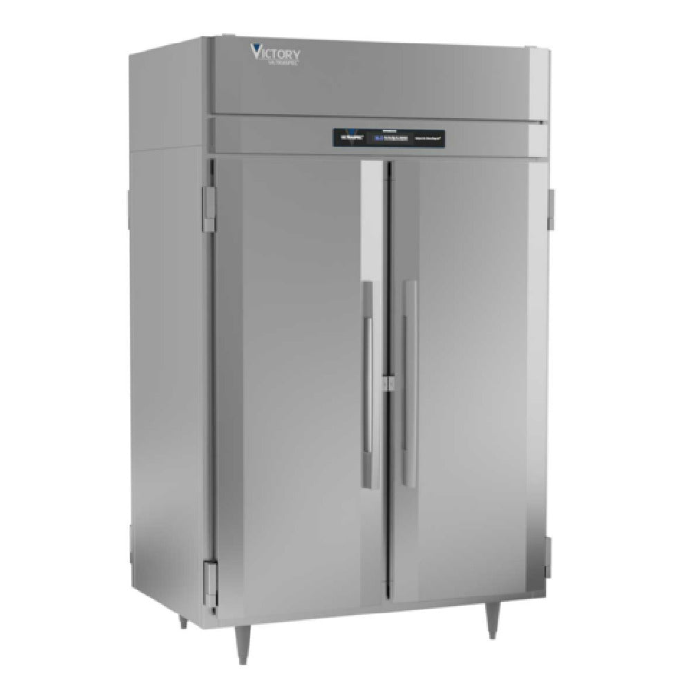 The Victory RS-2D-S1-PT-HC UltraSpec™ Series Refrigerator Powered By V-Core™ Pass-thru is an advanced refrigeration solution designed for varied commercial applications. This two-section, self-contained unit offers a substantial 48.33 cubic feet capacity, making it ideal for industries needing ample refrigerated space. It features four full-height solid hinged doors and six silver freeze (chrome-style) shelves, providing versatile storage options. The stainless steel exterior and interior ensure durability and ease of cleaning, while the standard depth cabinet fits seamlessly in many kitchen layouts. Equipped with TOUCH POINT™ electronic temperature control and indicator, users can easily manage temperature settings for optimal performance. LED lighting enhances visibility, and expansion valve technology increases efficiency. Santoprene door gaskets come with a 2-year warranty, offering long-term reliability. The refrigerator utilizes R290 Hydrocarbon refrigerant and a 1/3 horsepower compressor, aligning with modern eco-friendly standards. Certified by cULus, UL EPH, and UL-Sanitation, it meets rigorous safety and sanitation requirements. This product is proudly made in the USA, ensuring high manufacturing standards. The Victory RS-2D-S1-PT-HC represents an ideal refrigeration choice, combining advanced technology with robust design for unmatched functionality in professional settings.