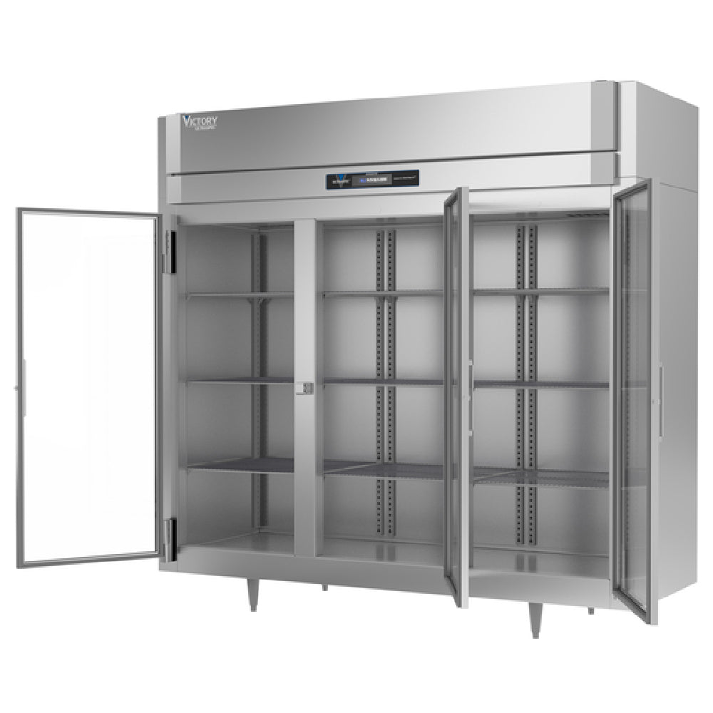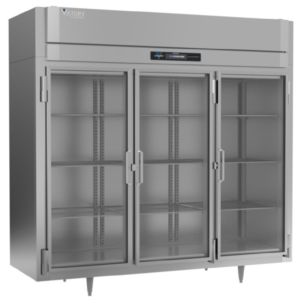 The Victory RS-3D-S1-EW-G-HC UltraSpec™ Series Refrigerator Powered By V-Core™ is a high-capacity refrigeration solution, designed for diverse commercial environments. With a reach-in, three-section configuration and a substantial 74.16 cubic feet capacity, it accommodates a wide range of storage needs. Its self-contained refrigeration system is enhanced by V-Core™ technology, ensuring efficient cooling performance. The unit features three wide, full-height hinged standard glass doors and nine silver freeze (chrome-style) shelves, making it suitable for easy organization and visibility of stored items. Constructed with a stainless steel exterior and interior, it boasts durability and ease of maintenance. The standard depth cabinet is equipped with TOUCH POINT™ electronic temperature control/indicator, offering precise temperature management. LED lighting further enhances visibility within the refrigerator. Incorporating expansion valve technology, the refrigerator optimizes cooling efficiency. Its Santoprene door gaskets come with a two-year warranty, providing reliable sealing. With 3/4 horsepower, this unit is UL-Sanitation, cULus, and UL EPH Classified, ensuring compliance with safety standards. Proudly made in the USA, the Victory RS-3D-S1-EW-G-HC is an ideal solution for food service operations that require robust, reliable, and efficient refrigeration.