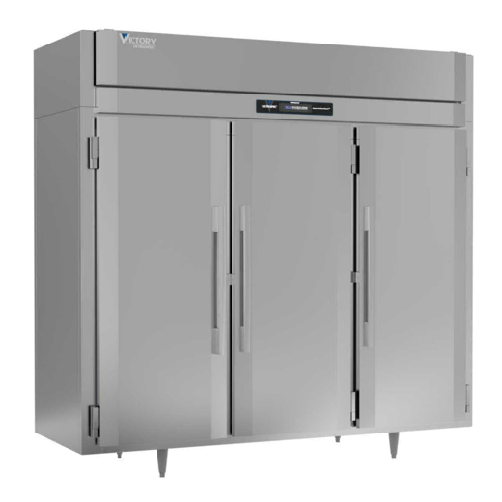 The Victory RS-3D-S1-EW-PT-HC UltraSpec™ Series Refrigerator Powered by V-Core™ is a high-capacity, pass-thru refrigerator engineered for efficiency and durability. This three-section unit boasts an 80.10 cubic feet capacity, making it an ideal choice for large-scale food service operations requiring substantial storage space. Equipped with six wide full-height solid hinged doors, it provides easy access while maintaining optimal storage conditions. The refrigerator includes nine silver freeze (chrome-style) shelves that ensure versatile storage options. Designed with both a stainless steel exterior and interior, the RS-3D-S1-EW-PT-HC is built for longevity and easy maintenance. Its standard depth cabinet is complemented by TOUCH POINT™ electronic temperature control and indicator, offering precise temperature management. Enhanced by LED lighting and expansion valve technology, the refrigerator ensures energy-efficient performance. The Santoprene door gaskets come with a two-year warranty, underscoring the commitment to quality. Utilizing R290 Hydrocarbon refrigerant and powered by a 3/4 HP motor, this unit meets the latest environmental standards. Certified by cULus, UL EPH Classified, and UL-Sanitation, this refrigerator is proudly made in the USA, embodying a blend of innovation and reliability for diverse industry markets.