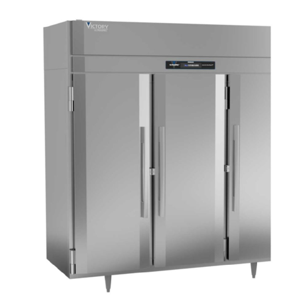 The Victory RS-3D-S1-HC UltraSpec™ Series Refrigerator Powered by V-Core™ Reach-in is a high-performance refrigeration solution tailored for diverse market segments within the food service industry. This three-section, self-contained refrigerator boasts a substantial capacity of 68.34 cubic feet, making it suitable for large-scale storage needs. It features three full-height solid hinged doors and is equipped with nine silver freeze (chrome-style) shelves, enhancing its storage versatility. Both the exterior and interior are crafted from durable stainless steel, ensuring longevity and ease of cleaning. The standard depth cabinet is complemented by TOUCH POINT™ electronic temperature control and indicator, providing precise temperature management. LED lighting enhances visibility, while expansion valve technology optimizes refrigeration efficiency. The refrigerator uses R290 Hydrocarbon refrigerant, which is environmentally friendly. Santoprene door gaskets come with a two-year warranty, demonstrating a commitment to quality and durability. Powered by a 3/4 HP motor, this unit meets cULus, UL EPH Classified, and UL-Sanitation standards, highlighting its safety and compliance credentials. Proudly made in the USA, the Victory RS-3D-S1-HC is an ideal choice for professionals seeking reliable and efficient refrigeration solutions in commercial kitchens, restaurants, and foodservice environments.