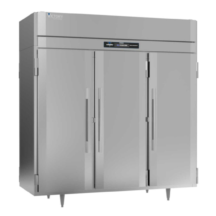 The Victory RS-3D-S1-PT-HC UltraSpec™ Series Refrigerator Powered By V-Core™ Pass-thru is a high-performance refrigeration solution tailored for the food service and hospitality industry. This three-section refrigerator boasts a significant capacity of 73.99 cubic feet, making it an excellent choice for establishments requiring extensive storage. Equipped with six full-height solid hinged doors and nine chrome-style silver freeze shelves, it ensures easy access and organized storage of ingredients. The stainless steel exterior and interior add both durability and a sleek appearance, while the standard depth cabinet fits seamlessly into various kitchen layouts. The TOUCH POINT™ electronic temperature control and indicator provide precise monitoring, complemented by LED lighting for enhanced visibility. Utilizing expansion valve technology and R290 Hydrocarbon refrigerant, it offers energy efficiency and environmental responsibility. The Santoprene door gaskets come with a two-year warranty, ensuring long-term product integrity. With a 3/4 HP motor and certifications including cULus, UL EPH Classified, and UL-Sanitation, this refrigerator meets stringent safety and performance standards. Proudly made in the USA, the Victory RS-3D-S1-PT-HC is an ideal asset for commercial kitchens, offering reliable refrigeration solutions that enhance operational efficiency. Stainless steel breakers contribute to its robust construction, making it a long-lasting choice for professional use.