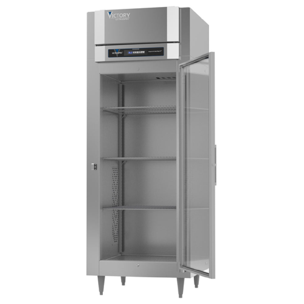 The Victory RSA-1D-S1-EW-G-HC UltraSpec™ Series Refrigerator Powered By V-Core™ is a high-performance, reach-in refrigerator designed for various professional settings. Engineered with a capacity of 24.08 cubic feet, this one-section unit includes a wide full-height hinged standard glass door, providing easy access and visibility to stored items. Equipped with three silver freeze (chrome-style) shelves, it offers versatile storage options. The exterior is crafted from durable stainless steel, while the interior features high-quality aluminum, ensuring longevity and easy maintenance. Its standard depth cabinet fits seamlessly into most professional environments. The TOUCH POINT™ electronic temperature control/indicator facilitates precise temperature management, complemented by energy-efficient LED lighting. The refrigerator incorporates expansion valve technology for optimal cooling performance. The Santoprene door gaskets, featuring a two-year warranty, enhance the unit's reliability. With stainless steel breakers and a 1/3 HP compressor, it ensures robust performance. Certified by cULus, UL EPH Classified, and UL-Sanitation, this refrigerator meets high safety and sanitation standards, and it is proudly made in the USA. The Victory RSA-1D-S1-EW-G-HC UltraSpec™ Series Refrigerator is an exceptional choice for sectors requiring dependable refrigeration solutions with advanced technology and high-quality construction.
