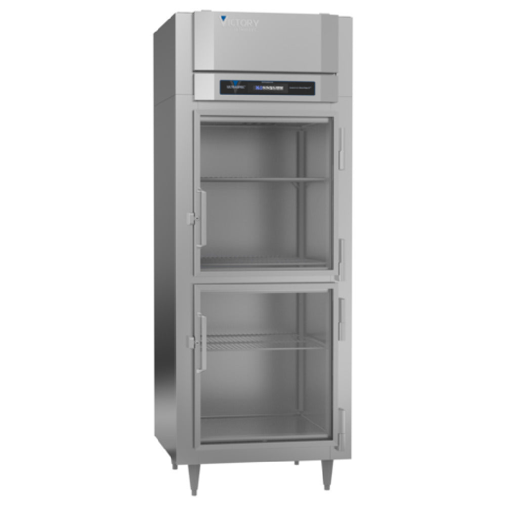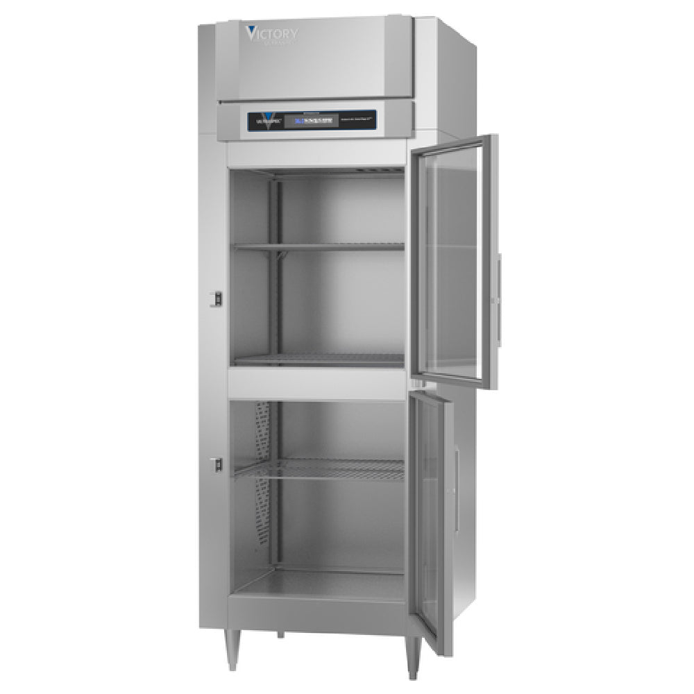 The Victory RSA-1D-S1-EW-HG-HC UltraSpec™ Series Refrigerator Powered By V-Core™ is a high-performance refrigeration unit tailored for professional settings requiring uncompromised quality and efficiency. With a 24.08 cubic feet capacity, this reach-in, one-section refrigerator boasts self-contained refrigeration and employs cutting-edge expansion valve technology for superior cooling efficiency. Its design includes two wide half-height hinged standard glass doors and three silver freeze (chrome-style) shelves, complemented by a stainless steel exterior and aluminum interior. The TOUCH POINT™ electronic temperature control and indicator ensure precise climate management, while LED lighting enhances visibility and energy efficiency. The model is built with Santoprene door gaskets backed by a two-year warranty, promoting long-lasting durability. A robust 1/3 HP motor powers the unit, supported by stainless steel breakers. It is classified under cULus, UL EPH, and UL-Sanitation standards, affirming its safety and efficiency credentials. Proudly made in the USA, this refrigerator serves as an ideal solution for various industry segments, offering reliability and advanced technology to meet the demanding needs of commercial refrigeration.