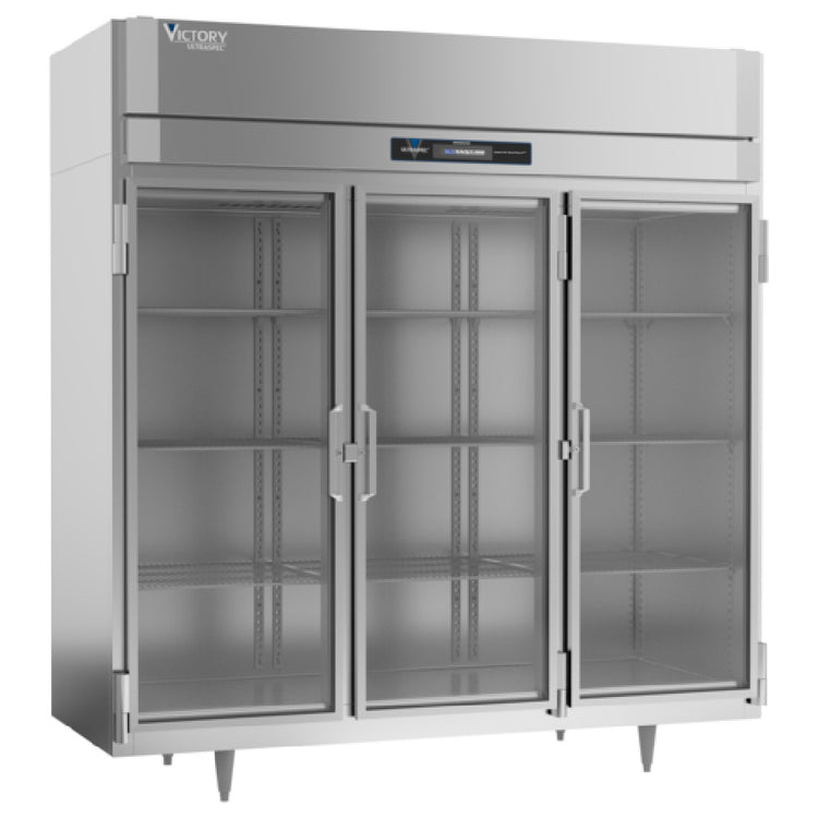 The Victory RSA-3D-S1-G-HC UltraSpec™ Series Refrigerator, Powered by V-Core™, Reach-in, is an advanced solution designed for commercial kitchens and food service operations. This three-section, self-contained refrigeration unit boasts a substantial 68.34 cubic feet of capacity, making it ideal for storing large quantities of perishable goods. The refrigerator features three full-height hinged standard glass doors, allowing for easy visibility and access to stored items. Inside, nine silver freeze (chrome-style) shelves provide ample storage and organization options. With a stainless steel exterior and aluminum interior, this refrigerator combines durability with a sleek appearance. The standard depth cabinet includes TOUCH POINT™ electronic temperature control/indicator, ensuring precise temperature regulation. LED lighting enhances visibility, while expansion valve technology optimizes cooling efficiency. The Santoprene door gaskets, backed by a two-year warranty, and stainless steel breakers further enhance the unit's reliability. Powered by a 3/4 HP motor, the Victory Refrigerator is cULus, UL EPH Classified, and UL-Sanitation certified, demonstrating its adherence to strict safety standards. Proudly made in the USA, this refrigerator is a dependable choice for businesses seeking high-performance refrigeration solutions in the culinary industry.