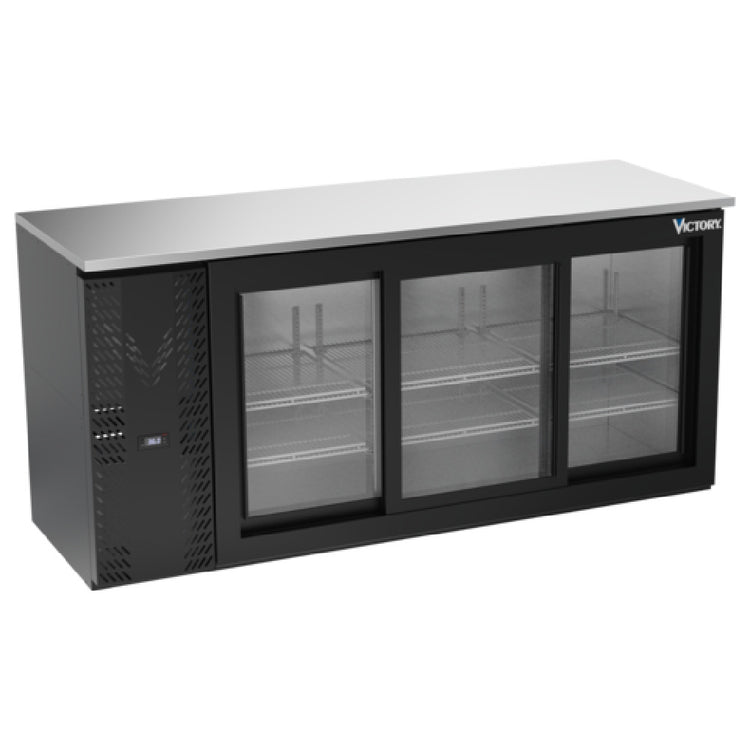 Victory Refrigeration, VBBN72HC-F-GS-B, Back Bar Refrigerator, Food Rated, three-section, 72"W x 26-1/4”D x 34"H, 19.618 cu. ft., (3) self-closing sliding glass doors with stay-open feature and locks, full electronic control, (6) epoxy coated steel shelves, (3) 1/2 barrel kegs, LED lighting, 1" stainless steel top, black exterior finish, stainless steel Interior, R290 Hydrocarbon refrigerant, 1/3 HP, 3.3 amps, 115v/60/1-ph, NEMA 5-15P, cULus, UL EPH Classified
