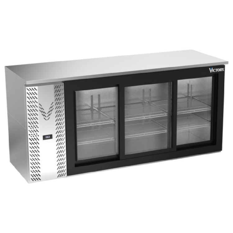 Victory Refrigeration, VBBN72HC-GS-S, Back Bar Refrigerator, three-section, 72"W x 25-1/4”D x 34"H, 19.618 cu. ft., (3) self-closing sliding glass doors with stay-open feature and locks, full electronic control, (6) epoxy coated steel shelves, (3) 1/2 barrel kegs, LED lighting, 1" stainless steel top, stainless steel exterior, stainless steel Interior, R290 Hydrocarbon refrigerant, 1/3 HP, 3.3 amps, 115v/60/1-ph, NEMA 5-15P, cULus, UL EPH Classified