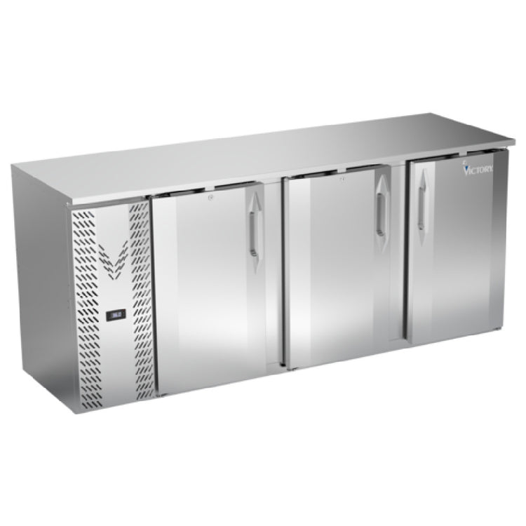 Victory Refrigeration, VBBN78HC-F-S, Back Bar Refrigerator, Food Rated, three-section, 78"W x 26-1/8"D x 34"H, 21.686 cu. ft., (3) solid self-closing doors with 120º stay-open feature, magnetic door gasket with door locks, full electronic control, (6) epoxy coated steel shelves, (4) 1/2 barrel kegs, LED lighting, 1" stainless steel top, stainless steel exterior, stainless steel Interior, R290 Hydrocarbon refrigerant, 1/3 HP, 3.3 amps, 115v/60/1-ph, NEMA 5-15P, cULus, UL EPH Classified