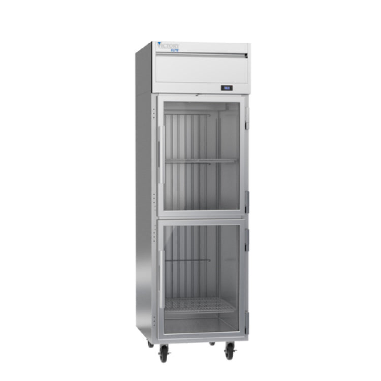 The Victory VERSA-1D-HG-HC Victory Elite™ Refrigerator Powered By V-Core™ Reach-in is an advanced refrigeration unit designed to meet the needs of various sectors within the food service industry. It features a compact yet spacious one-section design with dimensions of 26 inches in width and 85 inches in height, providing a storage capacity of 21.66 cubic feet. This refrigerator is equipped with two right-hand hinged half-height glass doors for easy access and visibility, alongside three adjustable shelves for customizable storage solutions. Utilizing top-mounted self-contained refrigeration powered by a 1/4 HP compressor, it ensures efficient cooling with the environmentally friendly R290 Hydrocarbon refrigerant. The electronic control system, complemented by a digital display, allows precise temperature management, while LED interior lighting enhances visibility within the aluminum interior. The exterior features a durable stainless steel front with gray-coated sides, ensuring longevity and aesthetic appeal. Certified by cULus, UL EPH Classified, and UL-Sanitation, this refrigerator emphasizes quality and safety standards. Proudly made in the USA, the Victory VERSA-1D-HG-HC Victory Elite™ Refrigerator is a reliable and versatile choice for any professional kitchen environment, delivering exceptional performance and energy efficiency with its innovative V-Core™ technology.