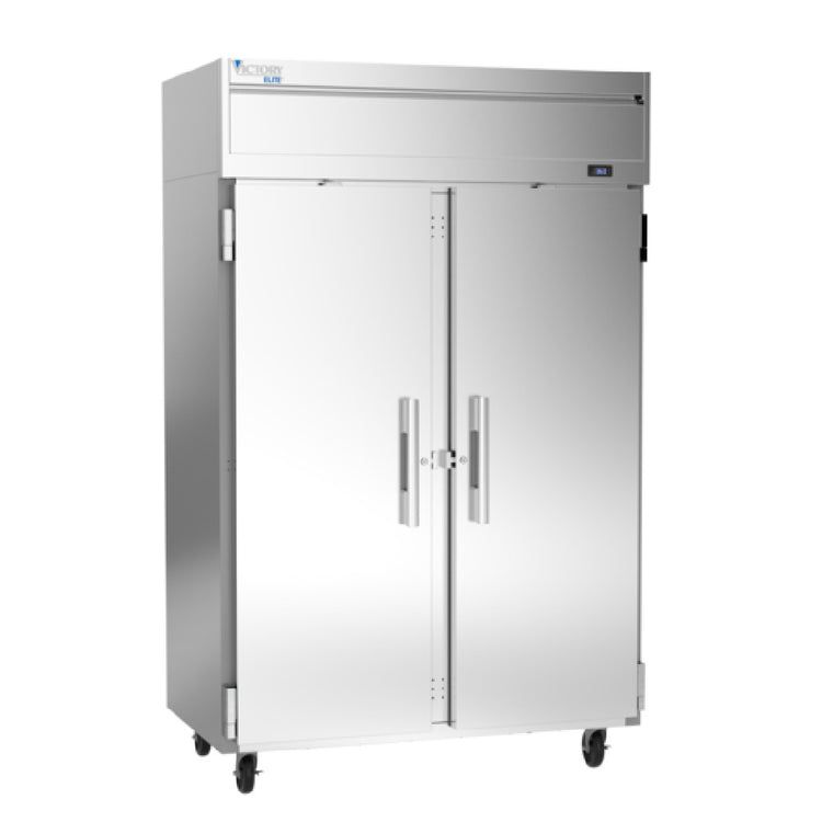 The Victory VERSA-2D-SD-HC Victory Elite™ Refrigerator Powered By V-Core™ Reach-in is a two-section, high-capacity refrigeration unit designed to meet the diverse needs of various market segments within the food service industry. This refrigerator features a spacious 52-inch width and an 84-7/8-inch height, offering an impressive 45.2 cubic feet of storage space. The unit is equipped with one right-hand hinged solid door and one left-hand hinged solid door, providing easy access to stored items. With six sturdy shelves, the VERSA-2D-SD-HC accommodates a wide range of product sizes and types. The electronic control system and digital display ensure precise temperature management, while the LED interior lighting enhances visibility. The stainless steel front and gray coated sides provide durability and a sleek aesthetic, complemented by an aluminum interior for efficient cooling. This refrigerator employs top-mounted self-contained refrigeration and utilizes R290 Hydrocarbon refrigerant, featuring Variable Speed Technology for energy efficiency. Certified by cULus, UL EPH Classified, and UL-Sanitation, and made in the USA, this refrigerator stands out for its reliable performance and adherence to safety standards. It is the perfect choice for businesses seeking a combination of advanced technology and robust storage capabilities.