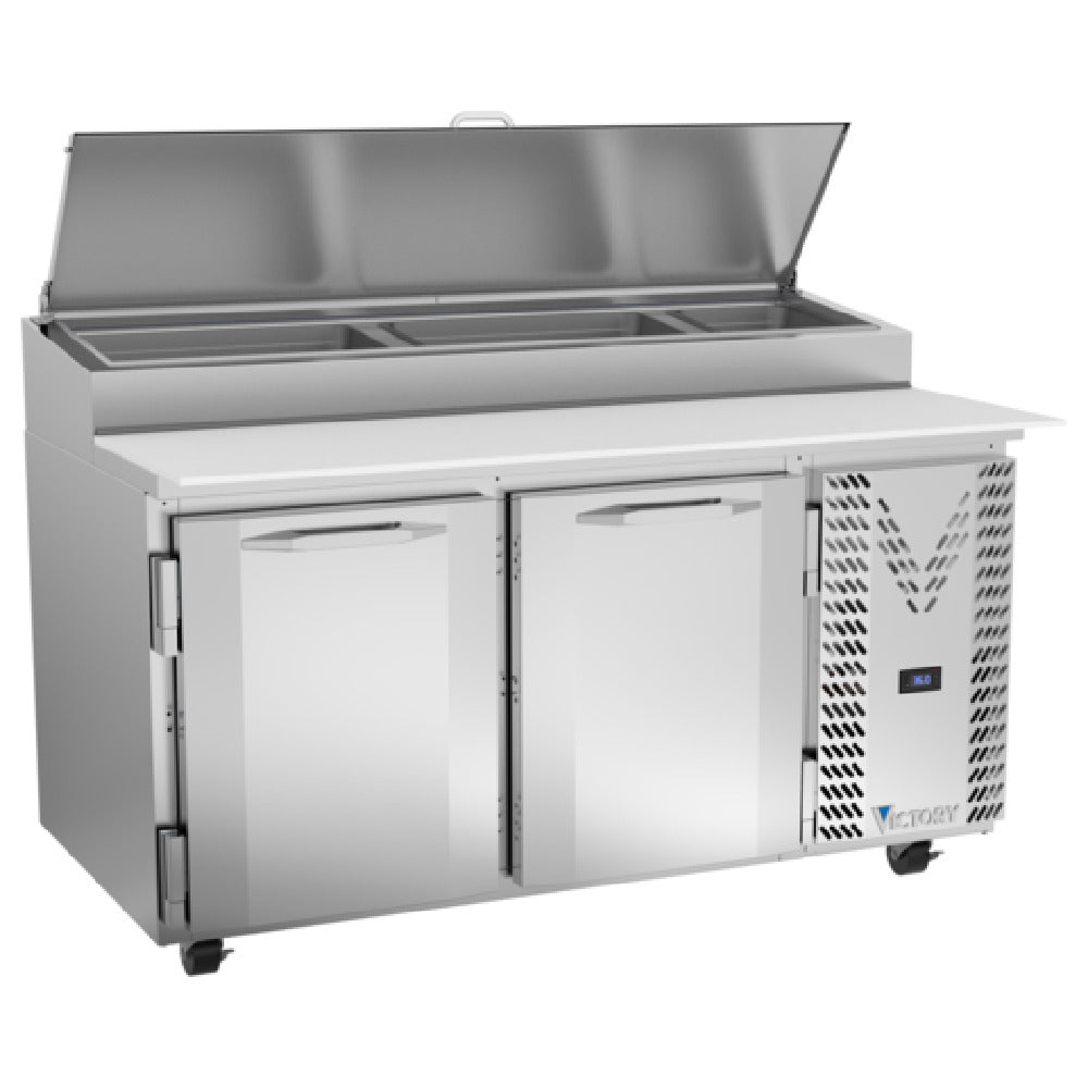 The Victory VPP60HC Pizza Prep Table Powered by V-Core™ Two-section is an innovative solution designed for efficiency and convenience in commercial kitchens. With a substantial 17.76 cubic feet capacity, this two-section unit measures 60-1/8 inches wide, offering ample space for preparation and storage. It features self-contained refrigeration with a side mount system, powered by a 1/2 horsepower compressor, ensuring consistent cooling performance. The table includes two self-closing stainless steel doors, enhancing temperature retention and energy efficiency. Four epoxy-coated shelves provide versatile storage options, while the 19-inch cutting board adds a practical prep surface. The hinged, insulated flat lift-up lid ensures easy access and temperature control. Full electronic control facilitates precise temperature management, making it ideal for busy foodservice environments. The construction incorporates a stainless steel top, doors, and sides with an aluminum interior, promoting durability and hygiene. Santoprene gaskets, which come with a two-year warranty, further enhance the unit's reliability. Certified by cULus, UL EPH Classified, and UL-Sanitation, and proudly made in the USA, the Victory VPP60HC is tailored to meet the rigorous standards of the food industry, offering a blend of functionality and robust performance for pizzerias, restaurants, and catering businesses.