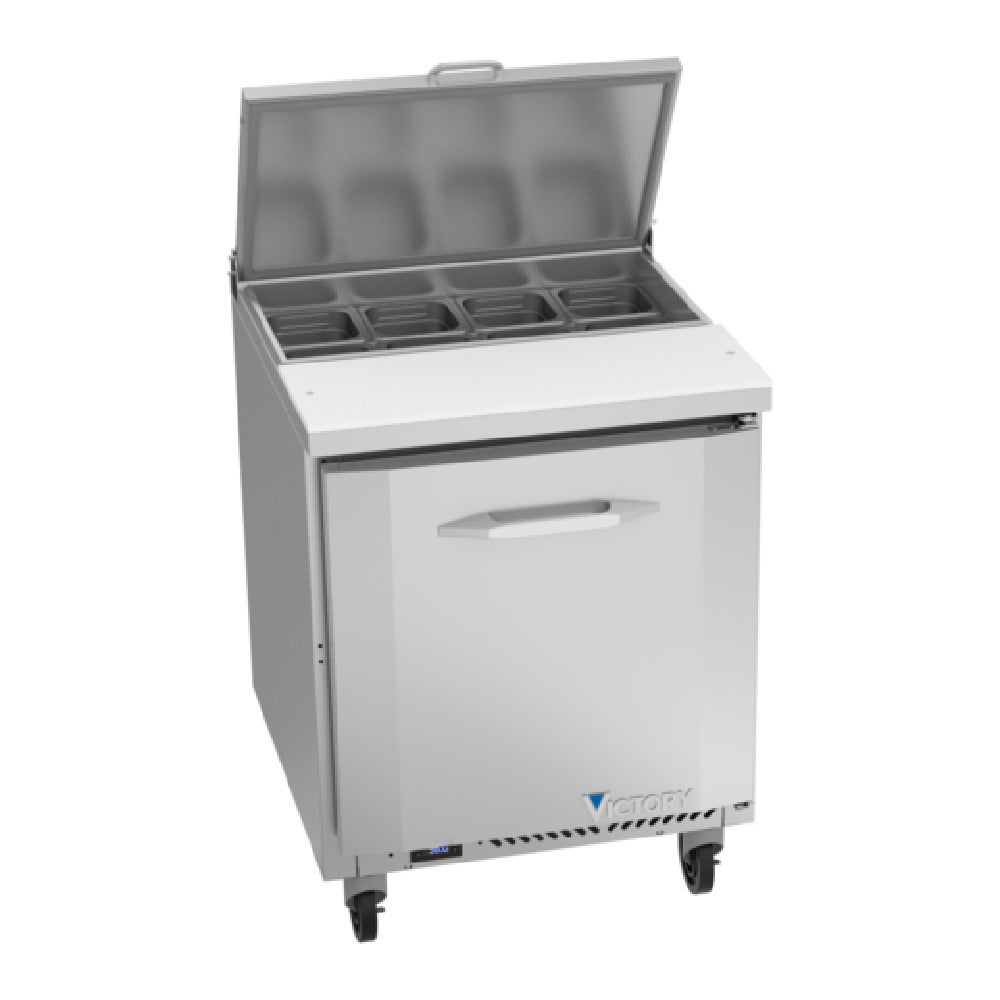 The Victory VSP27HC-08 UltraSpec™ Series Sandwich Prep Table Powered by V-Core™ is a highly efficient one-section unit that caters to various food service establishments with its robust features. Measuring 27 inches in width, it accommodates a self-contained refrigeration system with a 6.77 cubic feet capacity. The table is designed with a stainless steel top featuring openings for eight 1/6 size pans, making it ideal for sandwich preparation. It includes a 10-inch cutting board constructed from durable white polyethylene plastic, along with locking divider bars for organized ingredient storage. The unit is equipped with a full electronic control system and a rear-mounted refrigeration system that utilizes R290 Hydrocarbon refrigerant, supported by a 1/10 HP compressor. This ensures efficient cooling while being environmentally friendly. The exterior is crafted from stainless steel on the door, front, and sides, with an aluminum interior that enhances durability. Additional features include a self-closing door with Santoprene gaskets, which come with a two-year warranty, and two epoxy-coated shelves for added storage. The hinged, insulated flat lift-up lid ensures easy access and energy efficiency. Certified by cULus, UL EPH Classified, and UL-Sanitation, this unit is proudly made in the USA, emphasizing quality and reliability for any commercial kitchen.