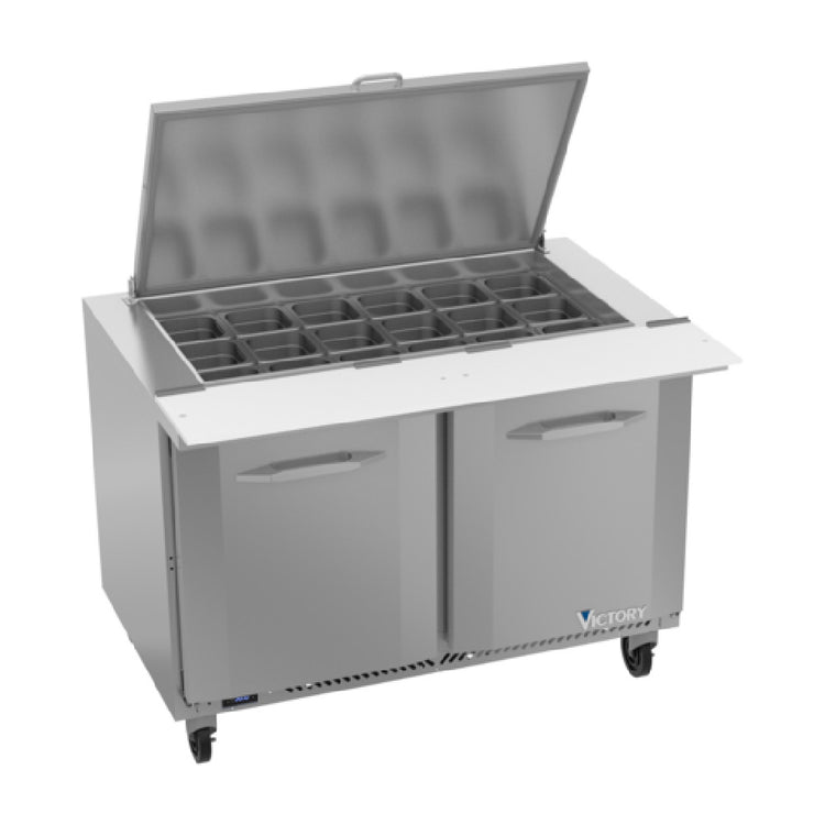 The Victory VSP48HC-18B UltraSpec™ Series Big Top Sandwich Prep Table Powered By V-Core™ is a versatile and efficient solution for commercial kitchens, designed to enhance productivity and preserve freshness. This two-section, 48-inch-wide unit boasts a self-contained refrigeration system with a 13.0 cubic feet capacity, making it ideal for high-demand environments. It features two self-closing doors and four epoxy-coated shelves, ensuring organized storage and easy access. The stainless steel top includes openings for eighteen 1/6 size pans, complemented by a 10-inch cutting board crafted from durable white polyethylene plastic. Locking divider bars offer additional security, while the hinged, insulated flat lift-up lid optimizes temperature retention. Full electronic controls provide precise operation, and the robust construction of stainless steel on the door, front, and sides, combined with an aluminum interior, enhances durability. Santoprene gaskets come with a two-year warranty, ensuring a lasting seal. The rear-mounted refrigeration system utilizes R290 Hydrocarbon refrigerant and operates with a 1/6 HP compressor, meeting cULus, UL EPH Classified, and UL-Sanitation standards. Proudly made in the USA, this prep table is a reliable asset for sandwich and deli establishments, enhancing workflow and ensuring quality.