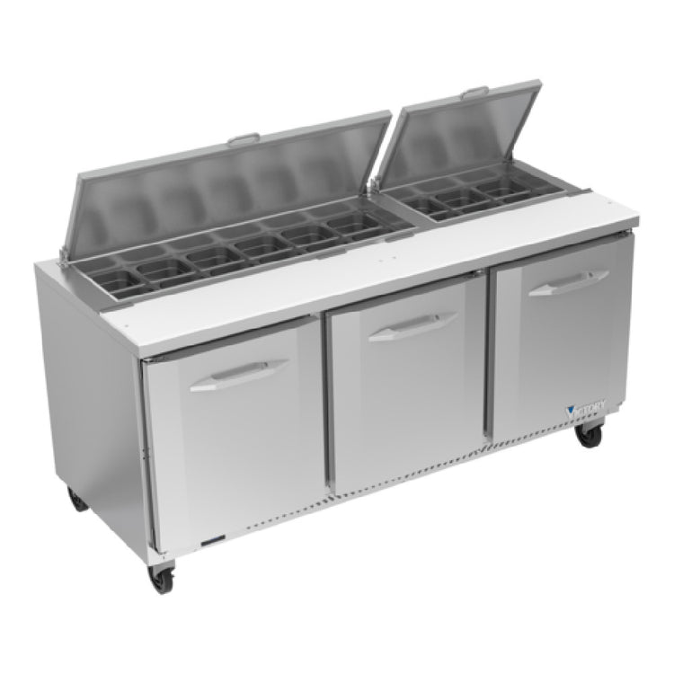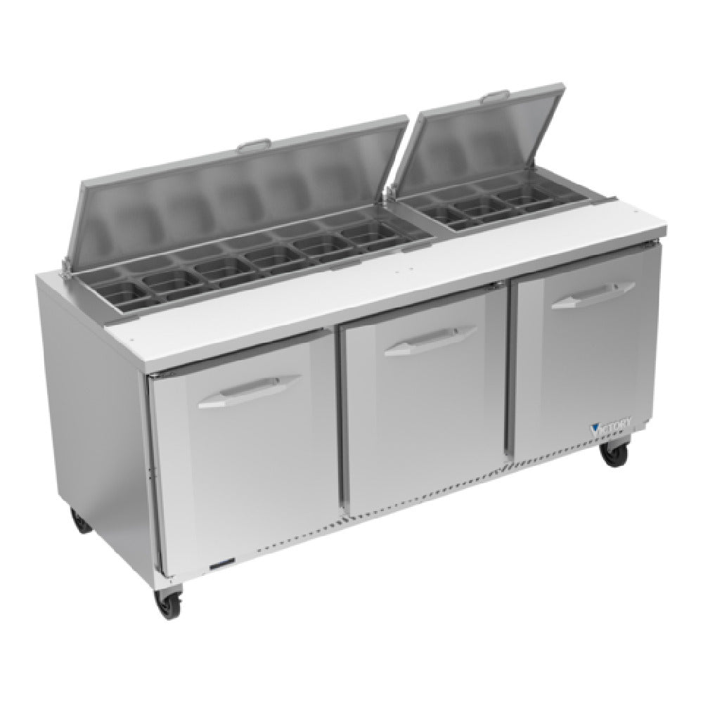 The Victory VSP72HC-18 UltraSpec™ Series Sandwich Prep Table Powered By V-Core™ is a high-performance unit designed for efficient food preparation in commercial settings. This three-section table measures 72 inches wide and boasts a self-contained design with a substantial 20.0 cubic feet capacity. It features three self-closing doors and six epoxy-coated shelves, offering ample storage and organization. The stainless steel top includes openings for eighteen 1/6 size pans, complemented by a 10-inch cutting board made from durable white polyethylene plastic. It also has locking divider bars and a hinged, insulated flat lift-up lid for added convenience. The table is equipped with full electronic controls and crafted with stainless steel doors, front, and sides, while the interior is made of aluminum. Enhanced by Santoprene gaskets with a two-year warranty, the unit ensures a reliable seal for temperature maintenance. The rear-mounted refrigeration system uses R290 Hydrocarbon refrigerant with a 1/3 horsepower compressor. The unit meets cULus, UL EPH Classified, and UL-Sanitation standards, and it is proudly made in the USA, making it a dependable choice for food service professionals seeking reliability and efficiency in their operations.